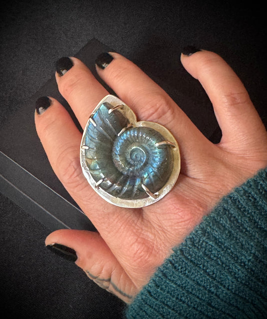Large Carved Labradorite Sterling Silver Ring - Size U
