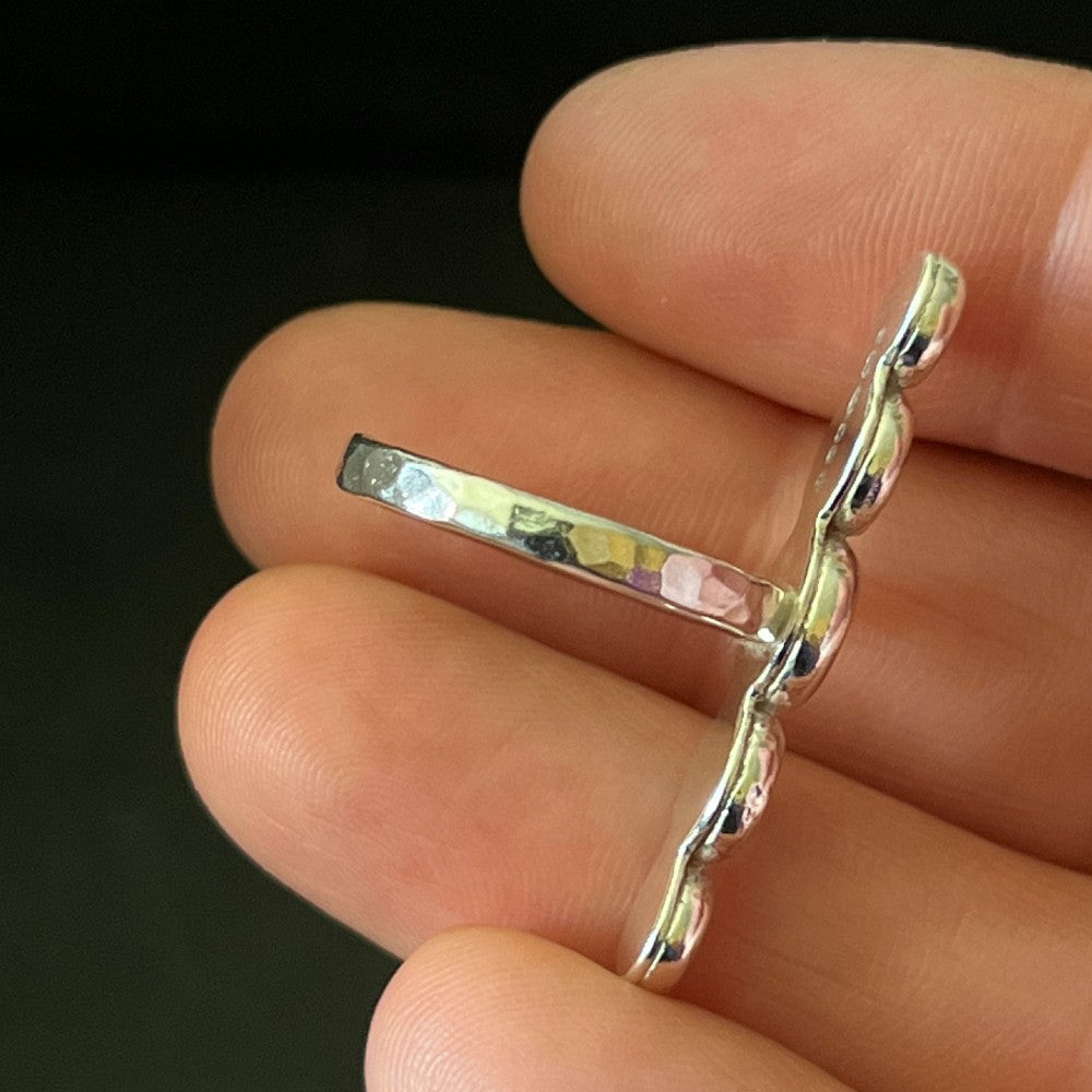 This handmade ring has 5 flattened pebbles. The pebbles are created by melting silver until it forms a ball, which is then hammered flat. It includes some texture to two of the pebbles and a hammered ring band.