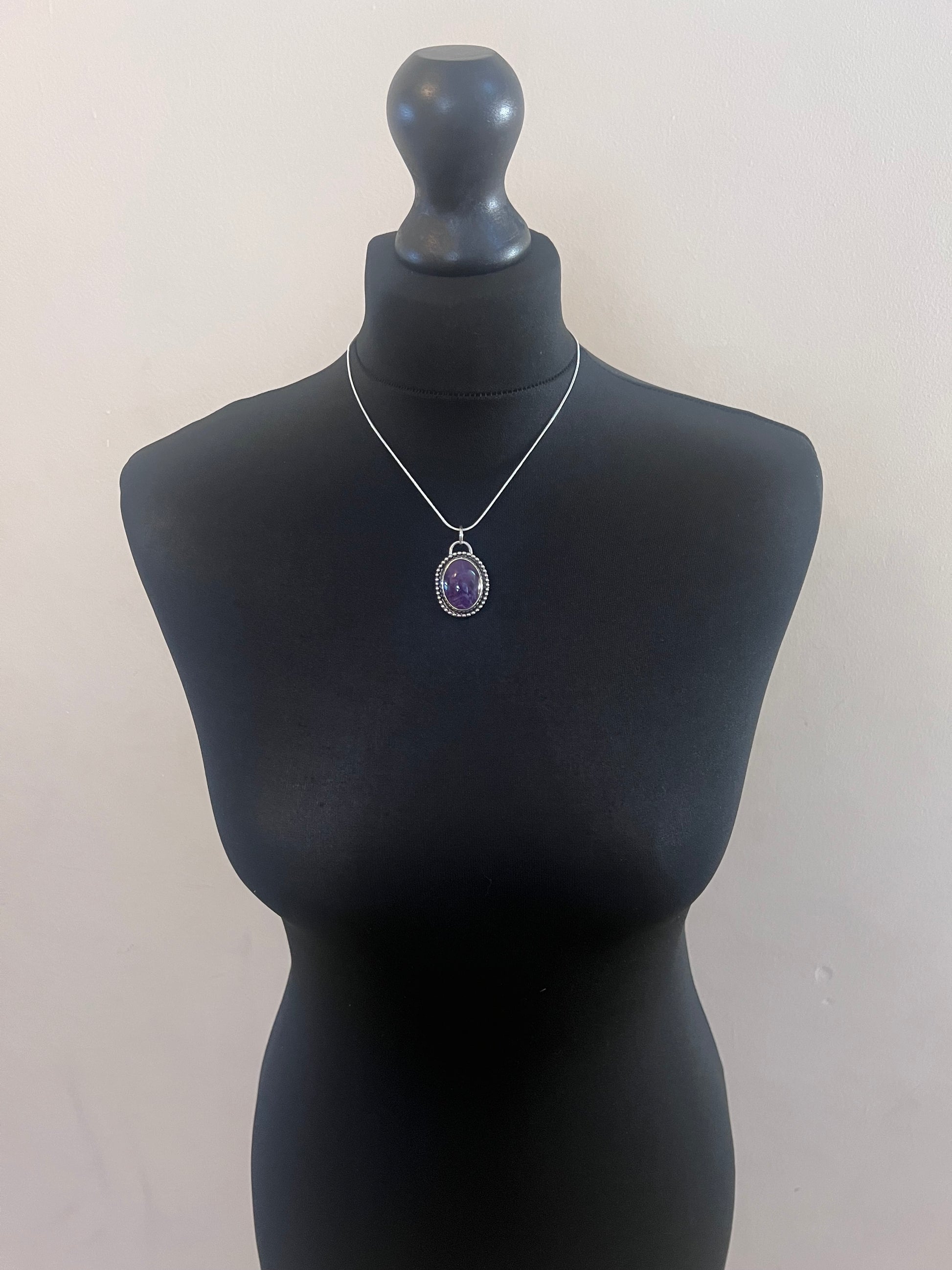 This handmade necklace has a beautiful amethyst set in sterling and fine silver surrounded by oxidised beading. It comes with a sterling silver 18" snake chain.