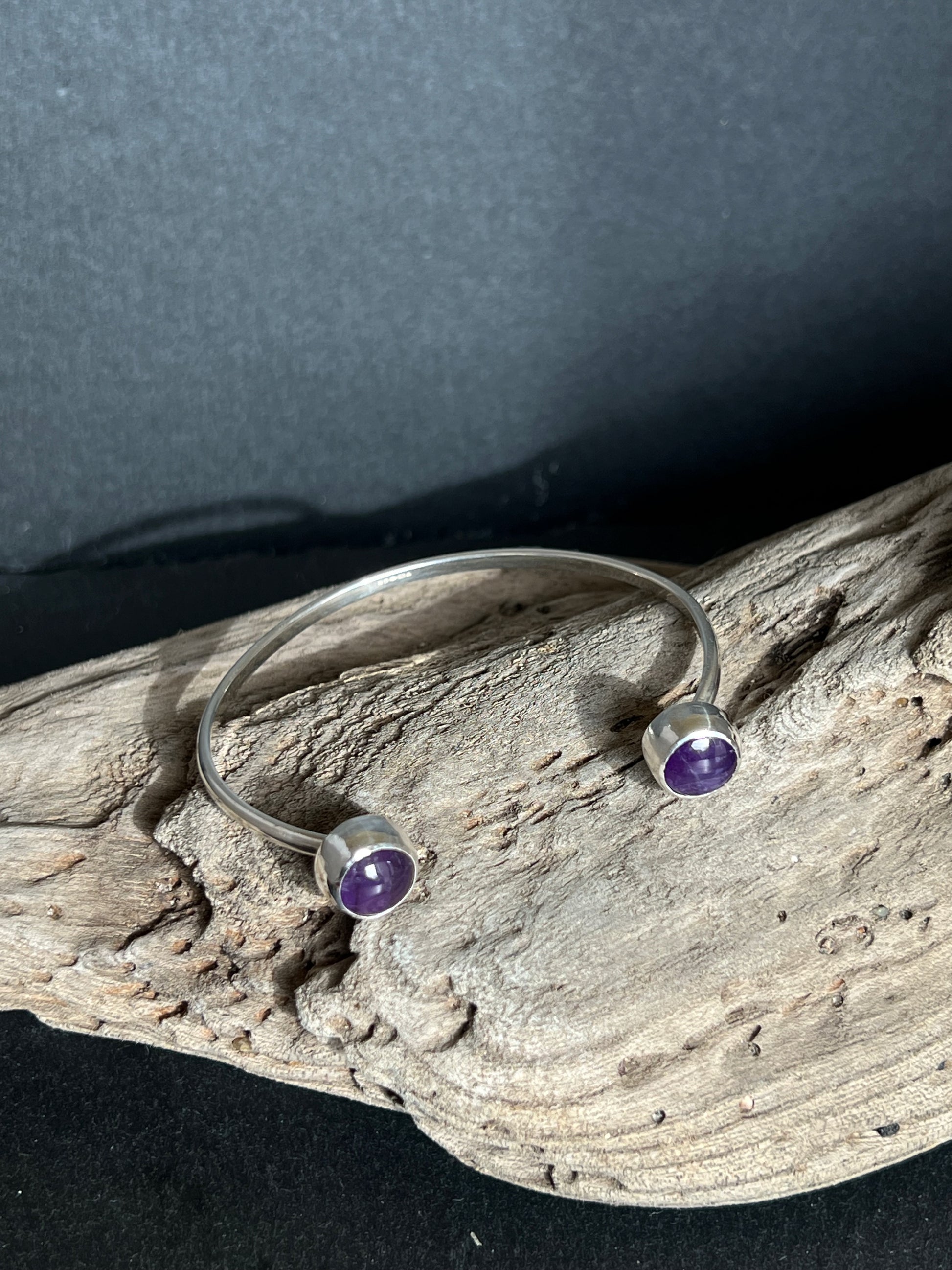 This sterling silver cuff has two amethyst stones set in sterling and fine silver.