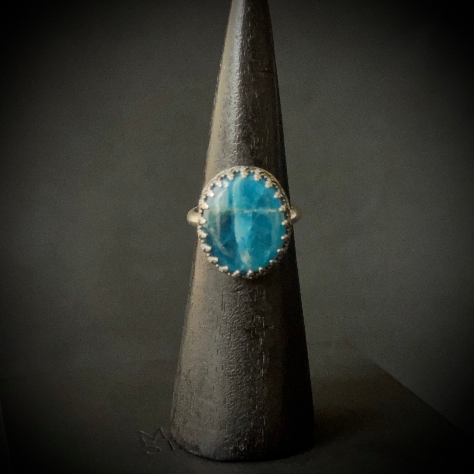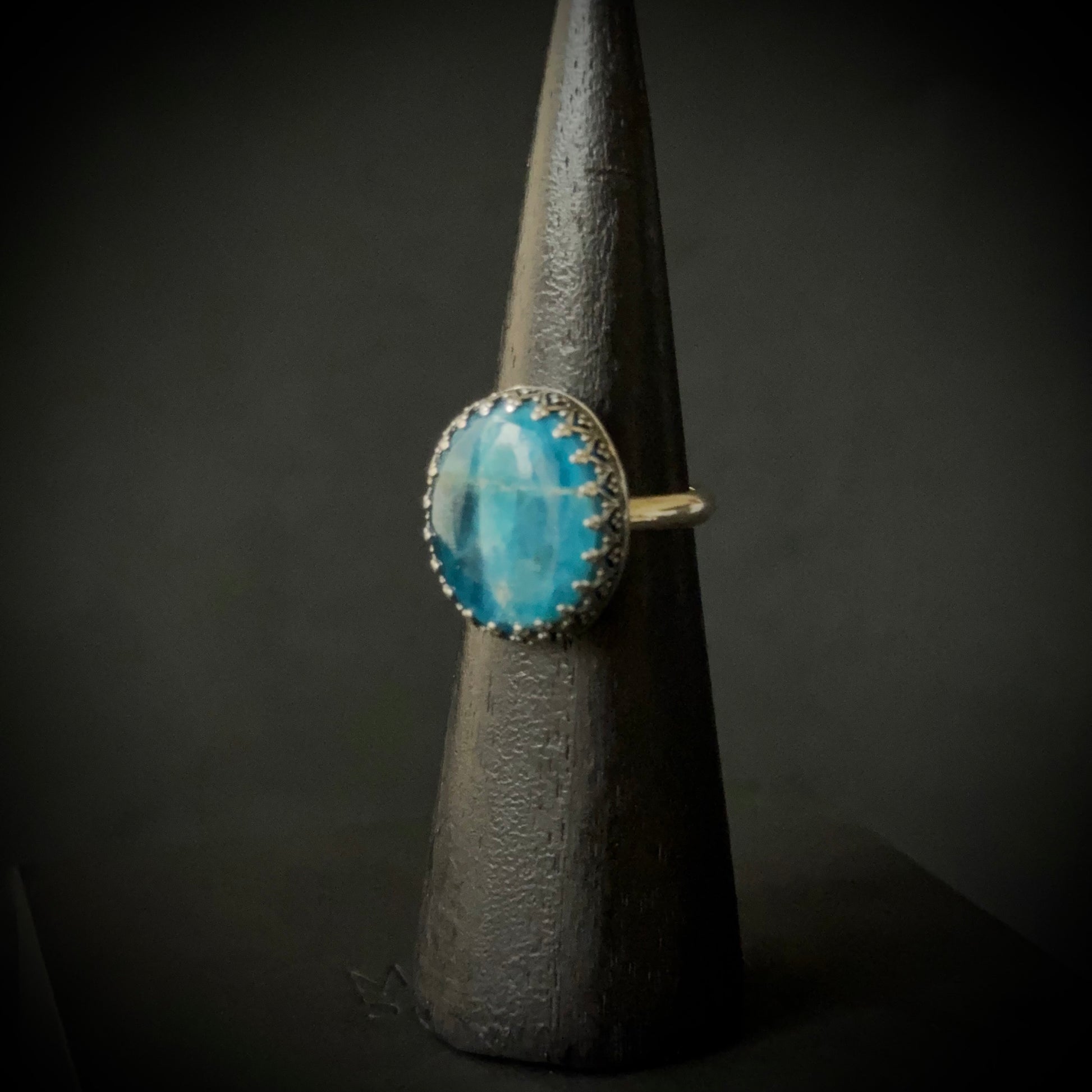 This beautiful statement ring has an apatite gemstone set in sterling and fine silver. It has a crown shaped fine silver bezel surrounding the gemstone.