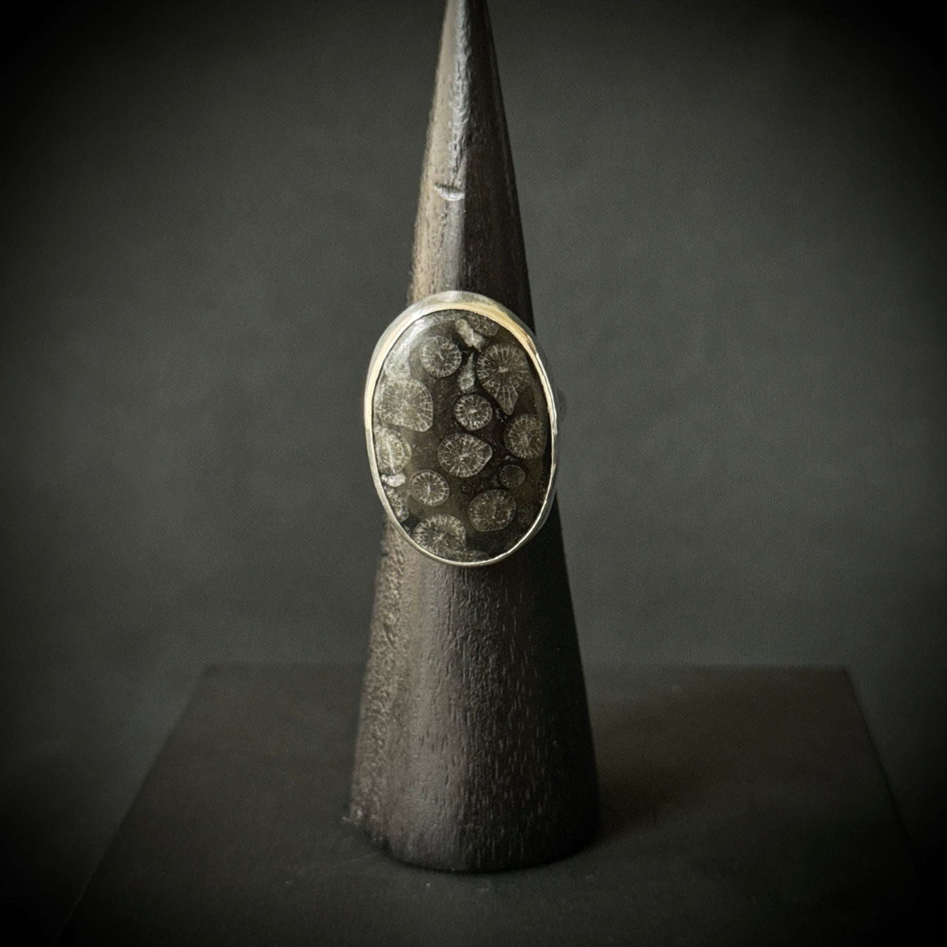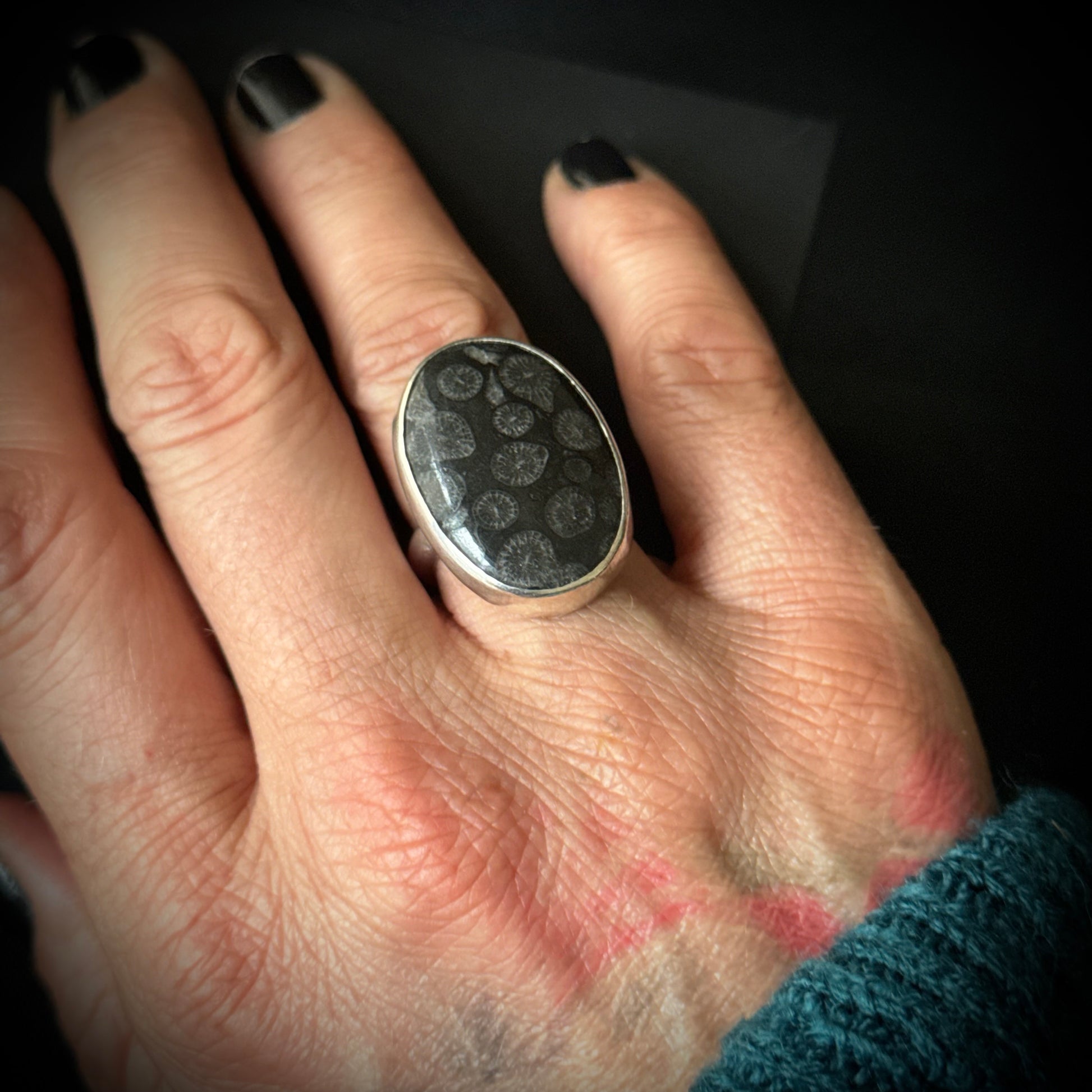 This statement ring has a black fossil coral stone set in sterling and fine silver.