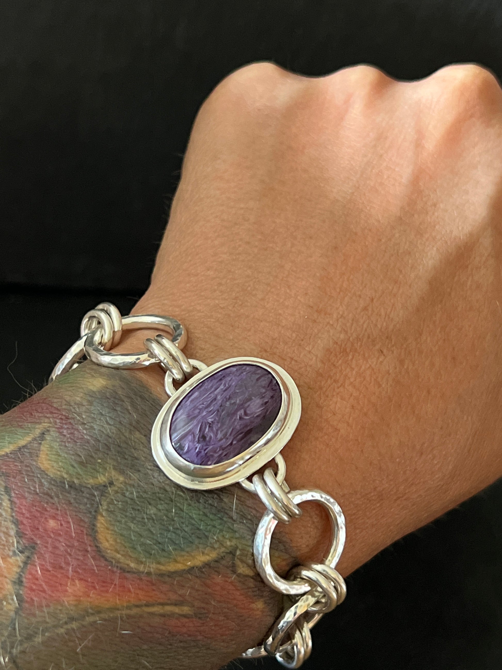 Oval Charoite Stone Sterlng Silver Chunky Chain Bracelet