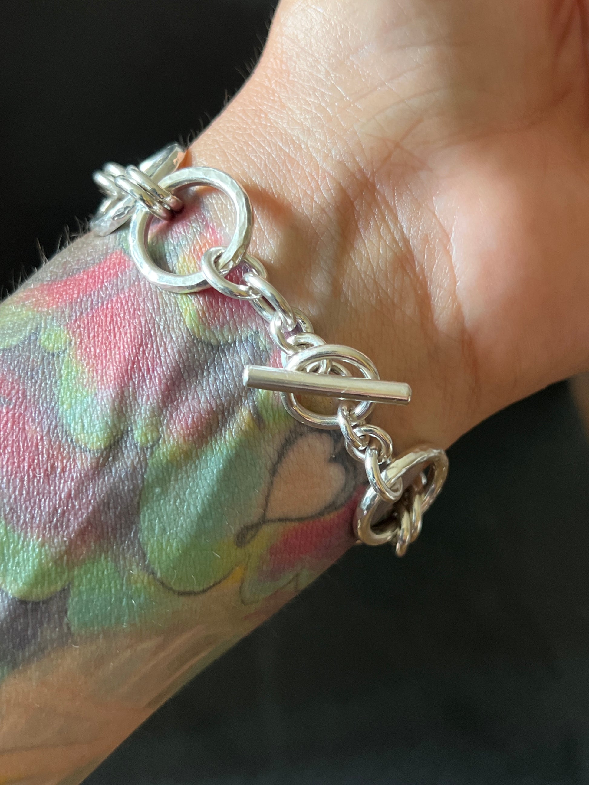 This beautiful charoite stone is set in sterling and fine silver with chunky hammered chain links made from sterling silver and a T-bar fastening.