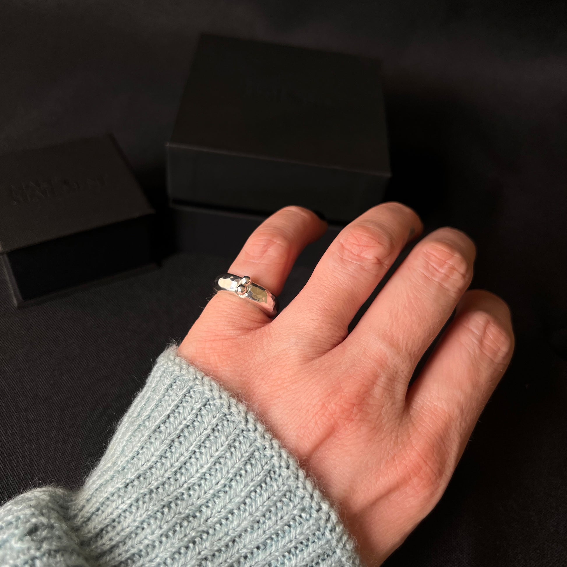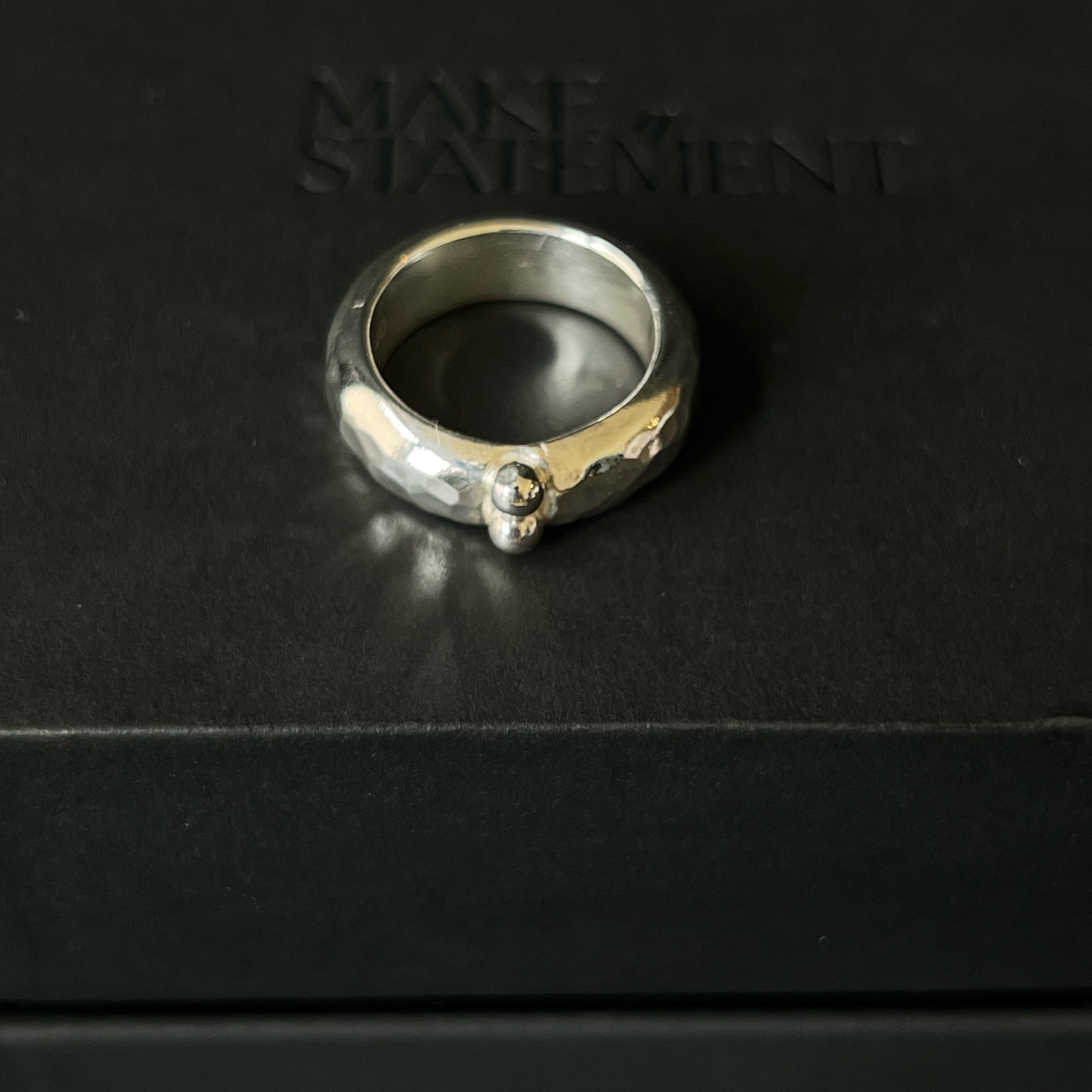 Handmade sterling silver unisex ring. This chunky ring has a hammered texture and has 2 sterling silver ball embellishments in the centre.