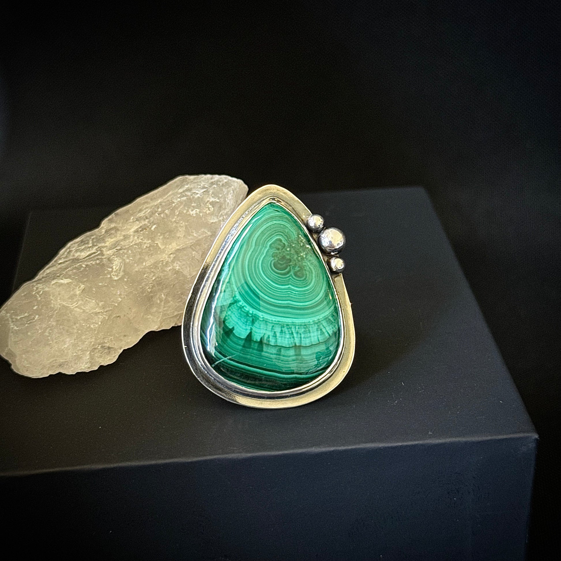 This beautiful malachite statement ring has silver ball embellishments and is set in 100% recycled sterling and fine silver.