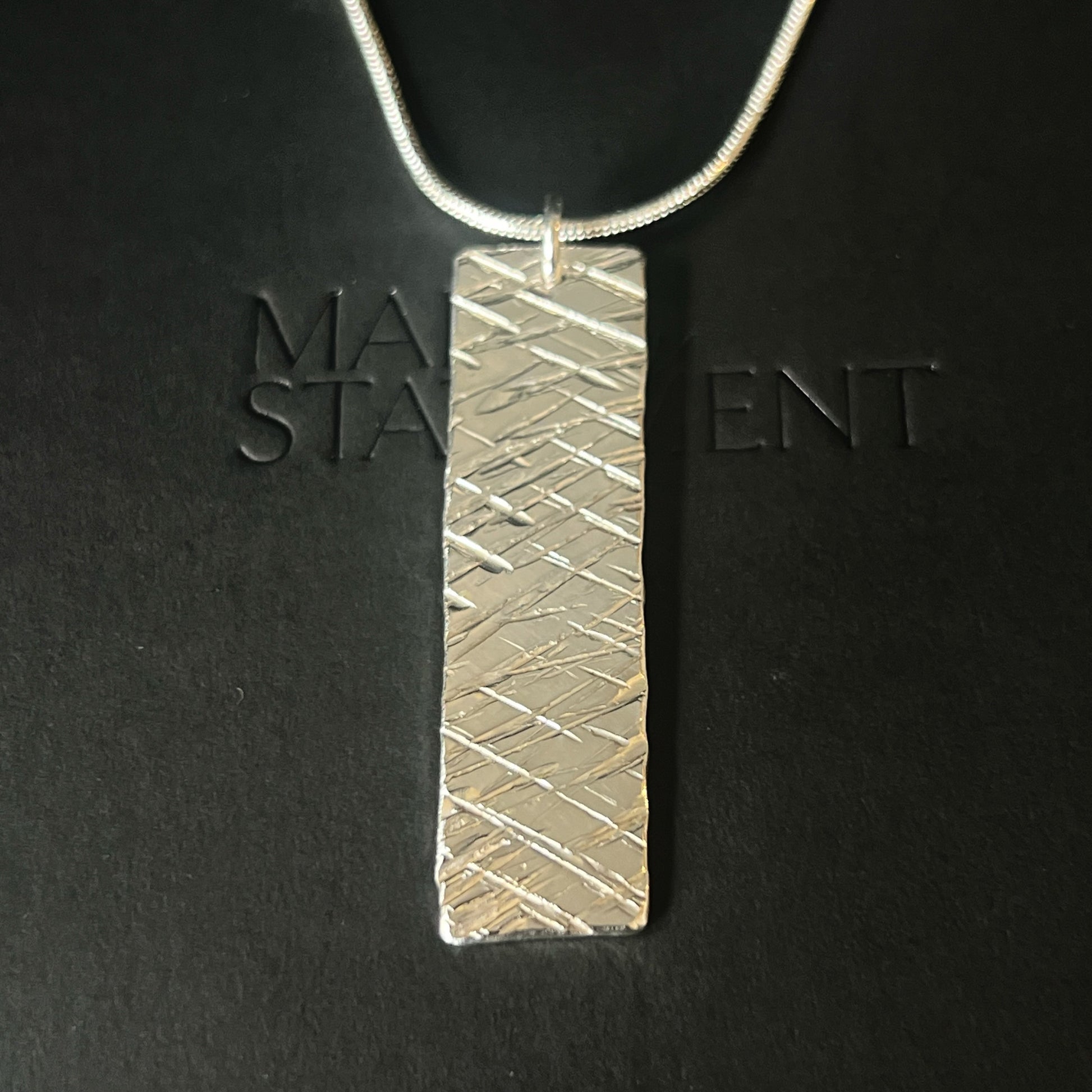 This handmade necklace is made from sterling silver and has been given a criss cross texture. It comes with an 18" snake chain.