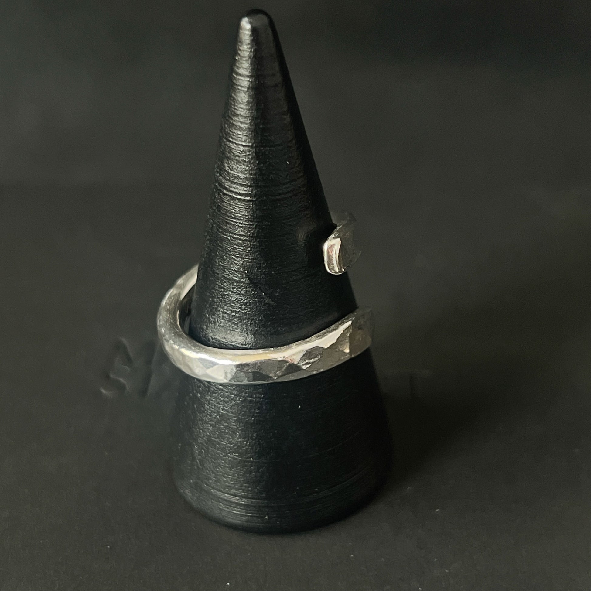 This handmade ring pebble ring is created by melting down sterling silver until it forms an organic ball. It has a textured sterling silver ring band.