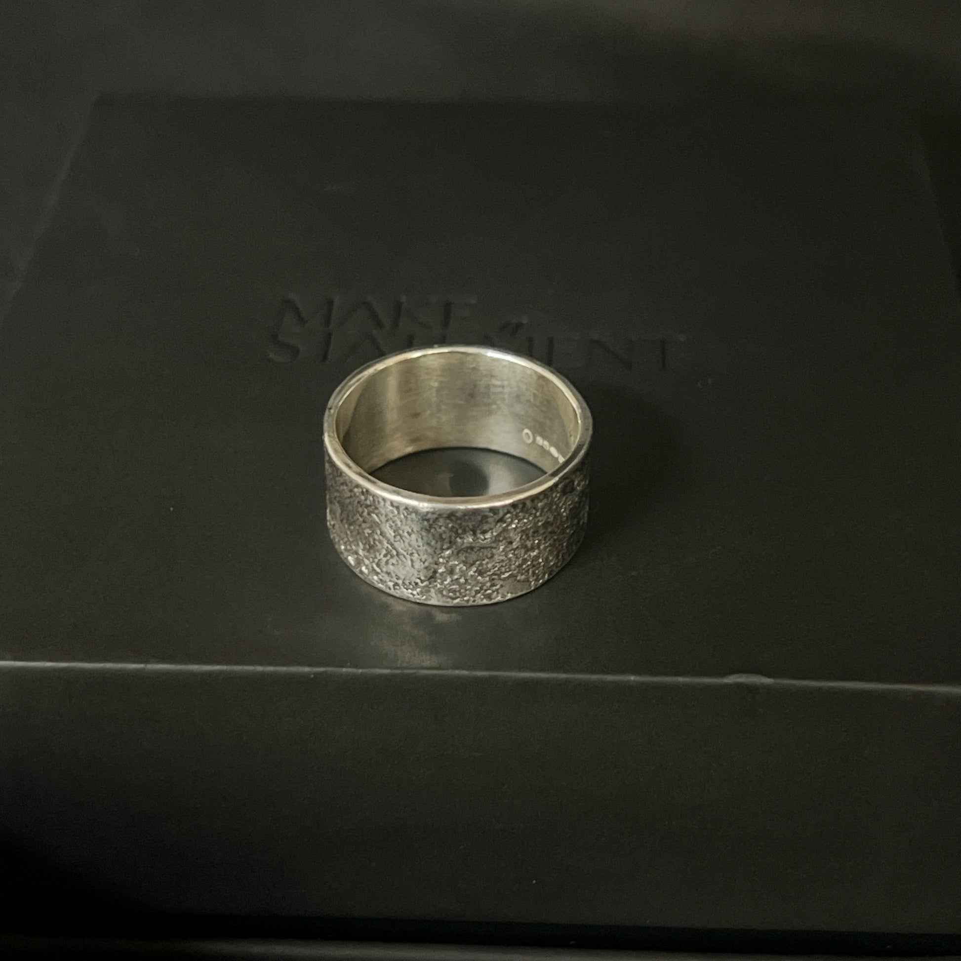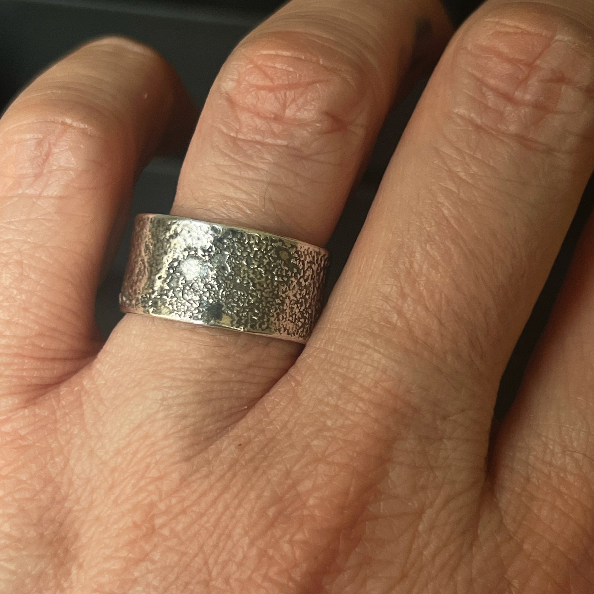 Handmade sterling silver unisex ring. The texture on this ring is created by collecting the silver dust from sawing and filing and then fusing it to sheet sterling silver. I have then oxidised the ring to highlight the detail.