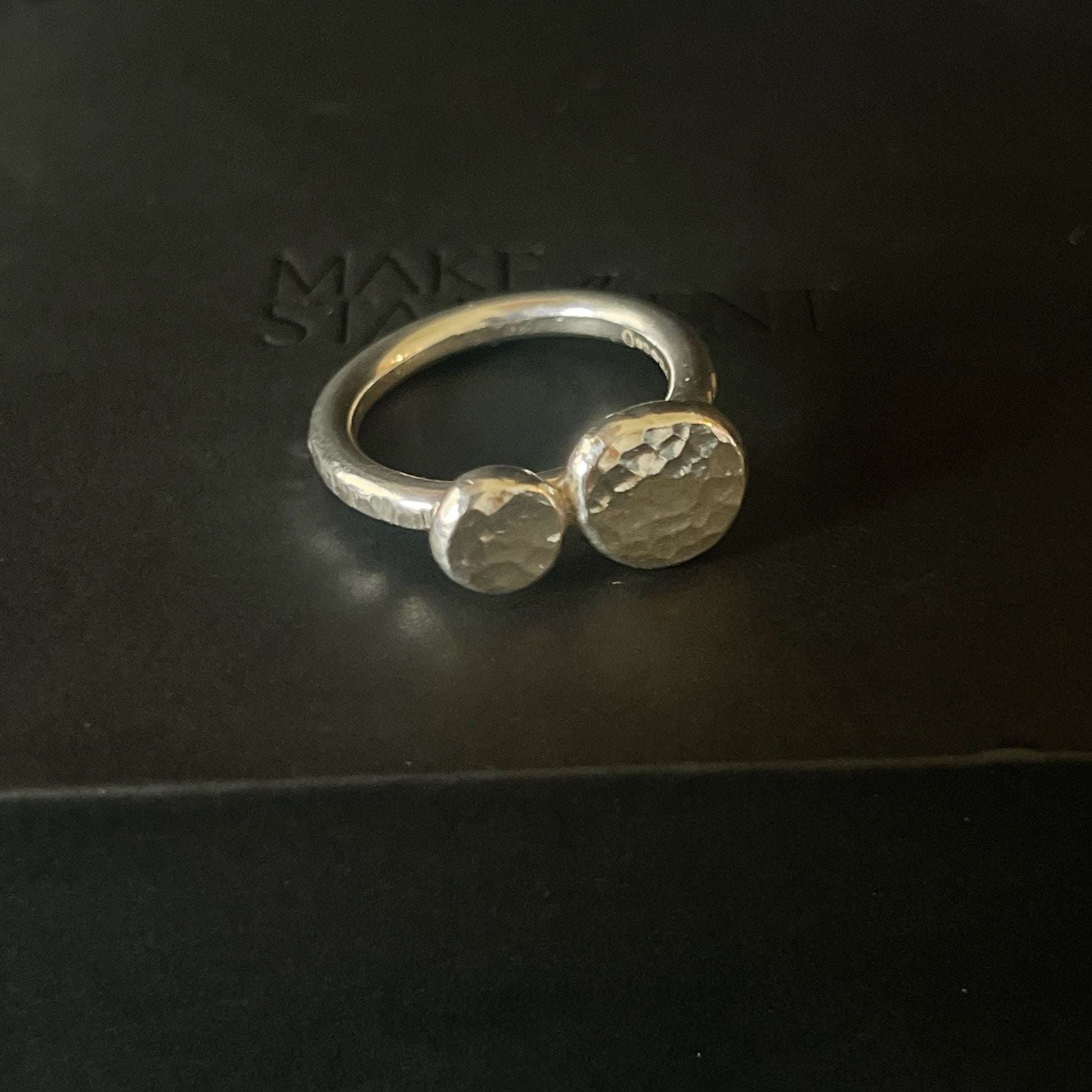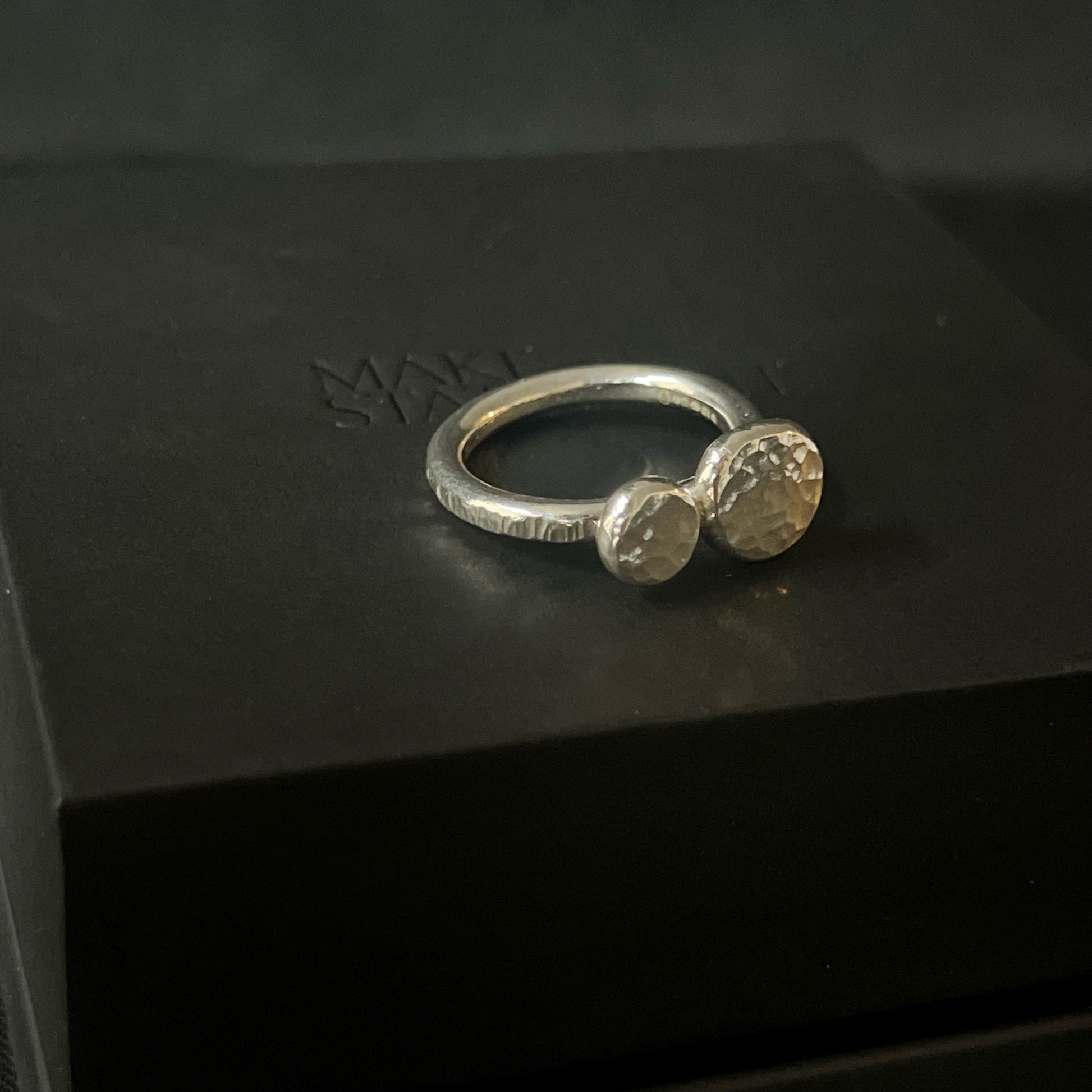 This handmade ring has 2 flattened pebbles with a hammered texture. The pebbles are created by melting silver until it forms a ball, which is then hammered flat. The ring band has a bark textured affect.