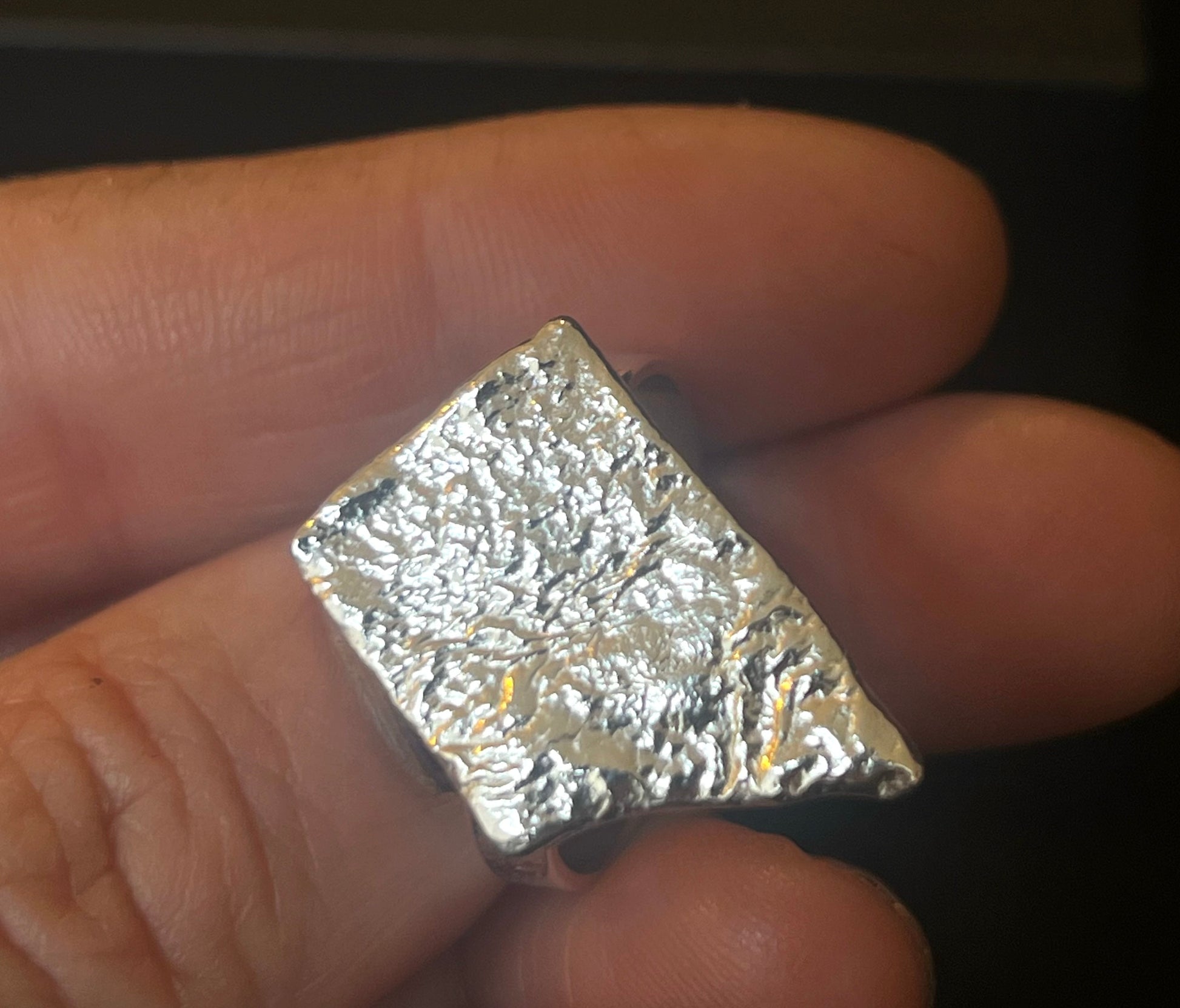 Unusual handmade sterling silver shard ring. The shiny texture on the shard and ring band is created by heating the silver until just before it melts.