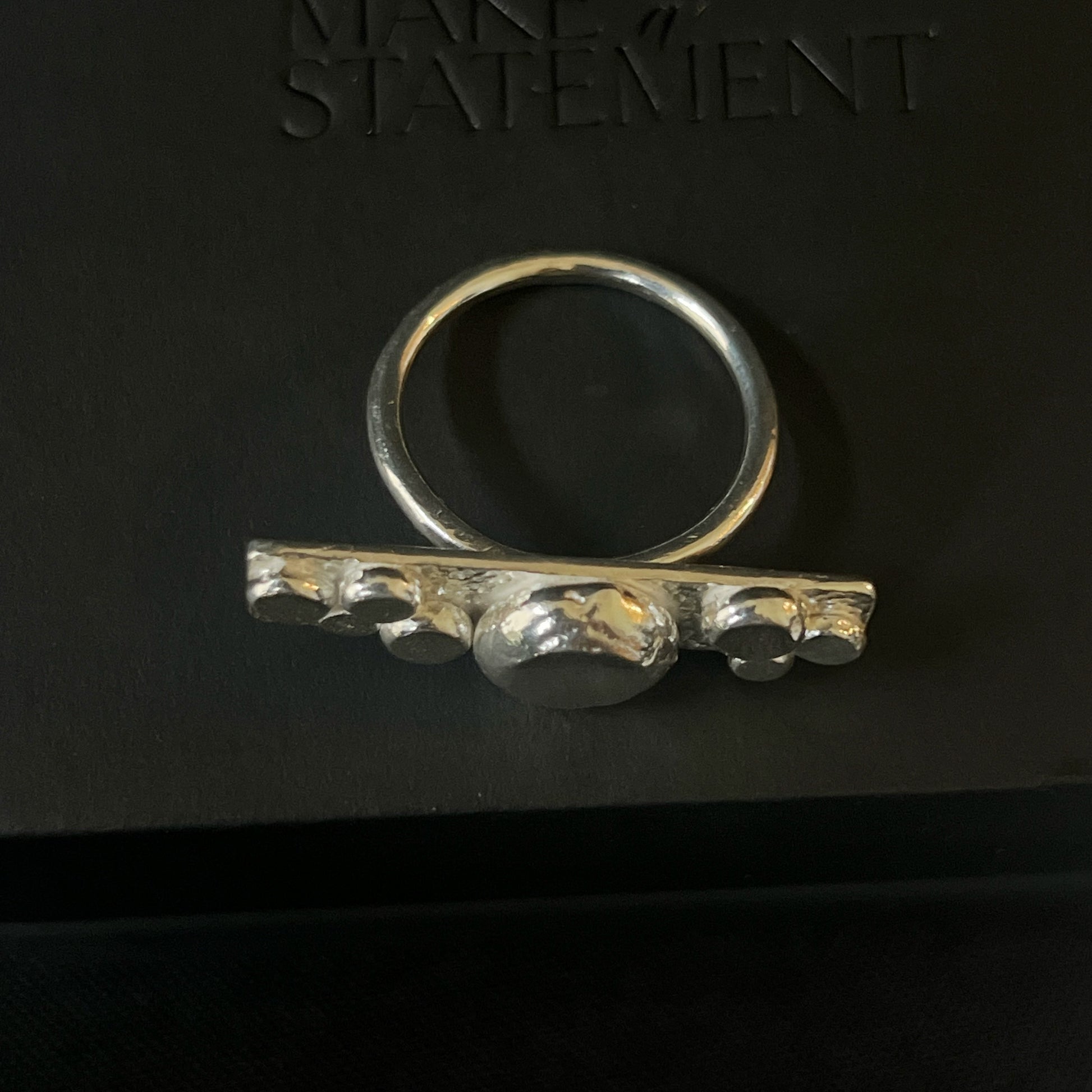 This handmade ring has 1 larger and 7 small flattened pebbles. The pebbles are created by melting silver until it forms a ball, which is then hammered flat. They have been soldered to a texture bar.