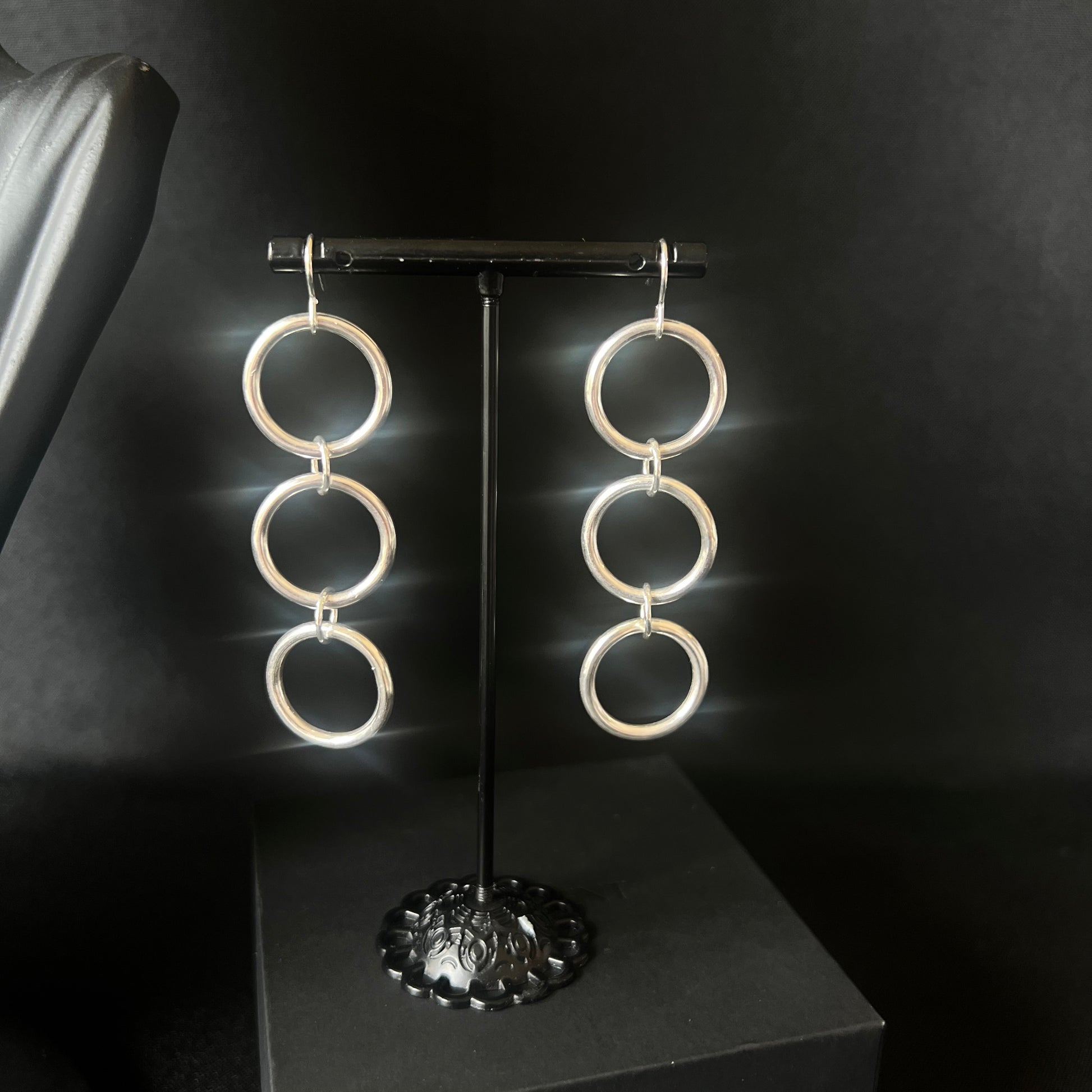 These handmade drop earrings have 3 chunky sterling silver circles, with smaller circles