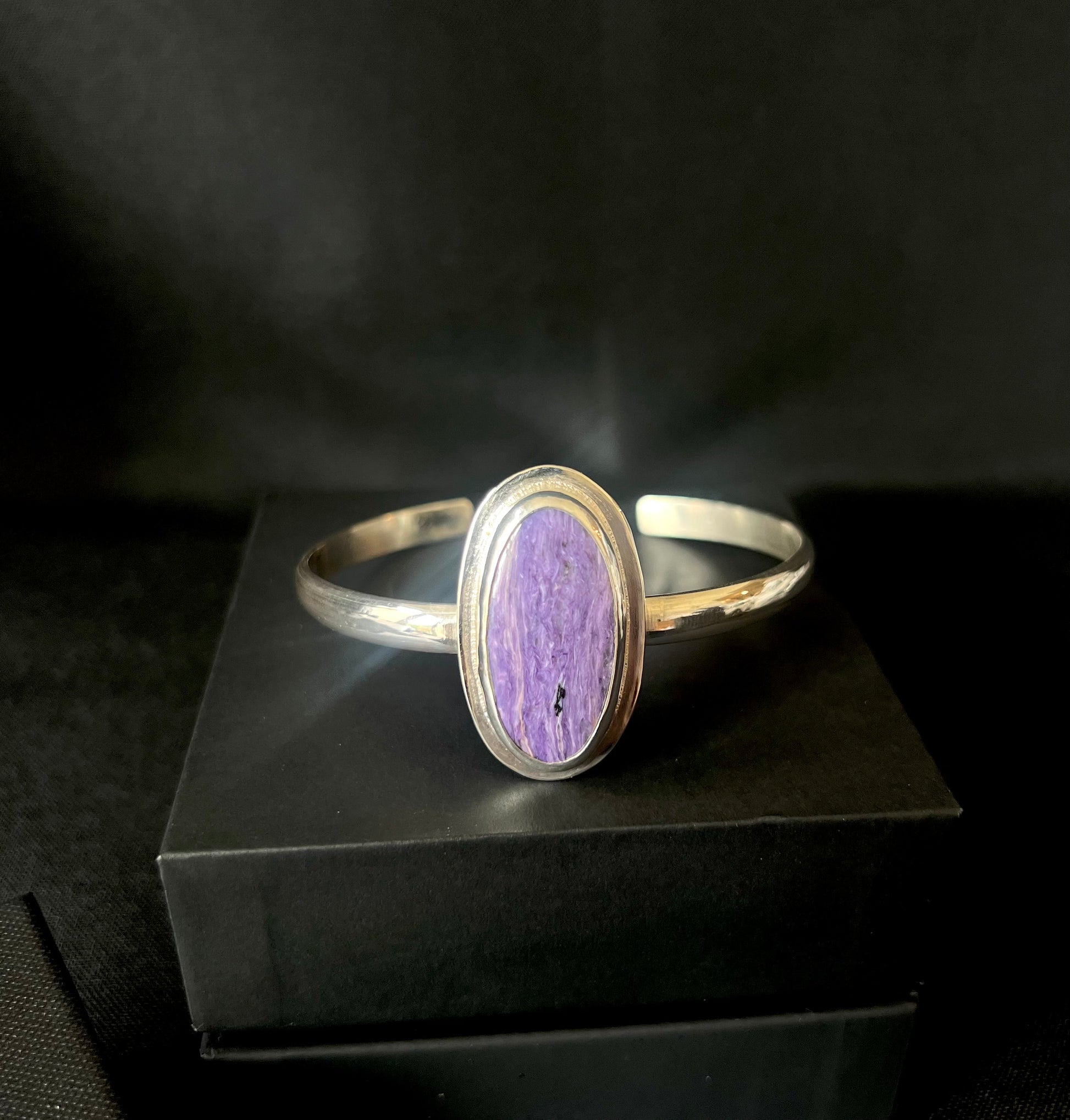 This sterling silver cuff has a beautiful charoite stone set in sterling and fine silver.