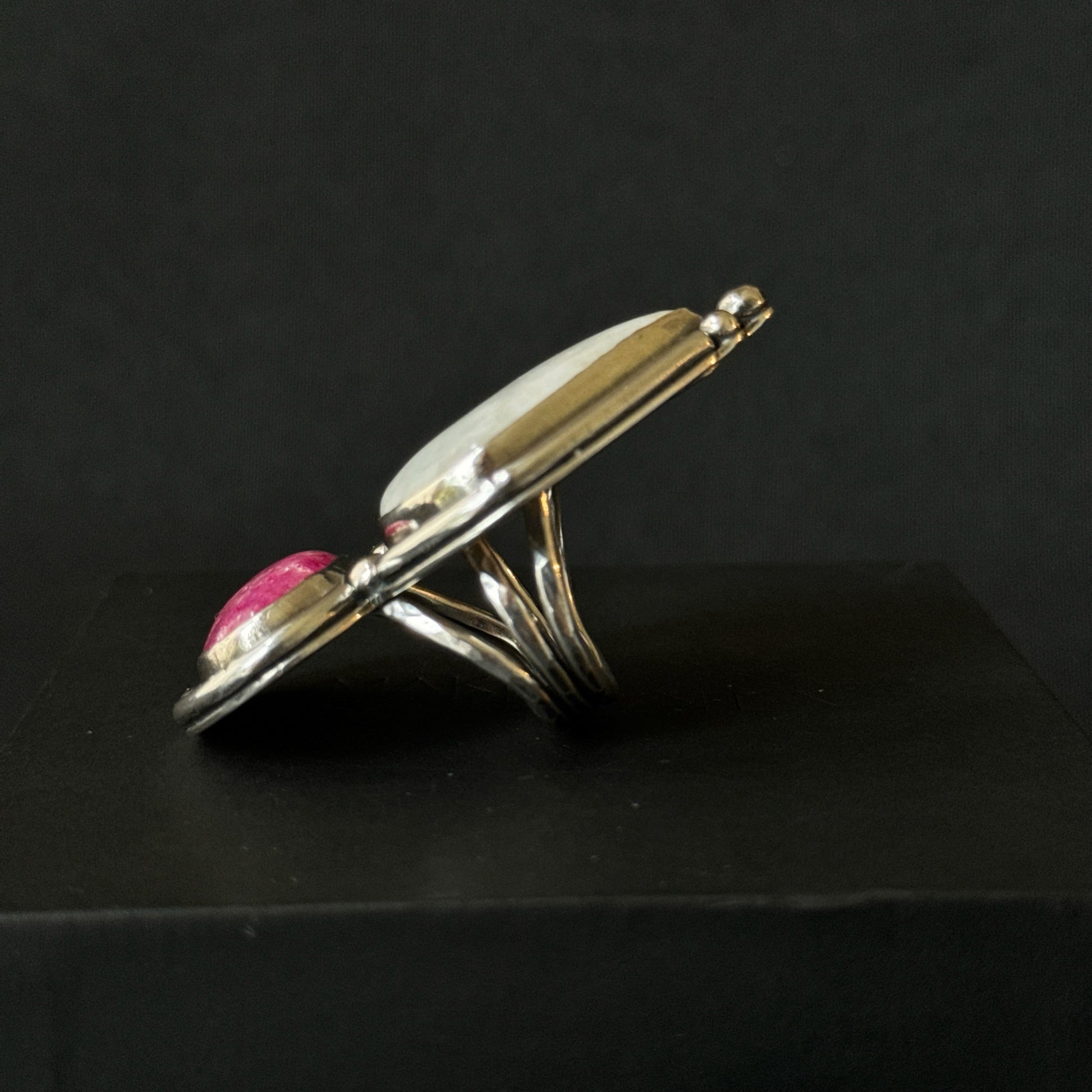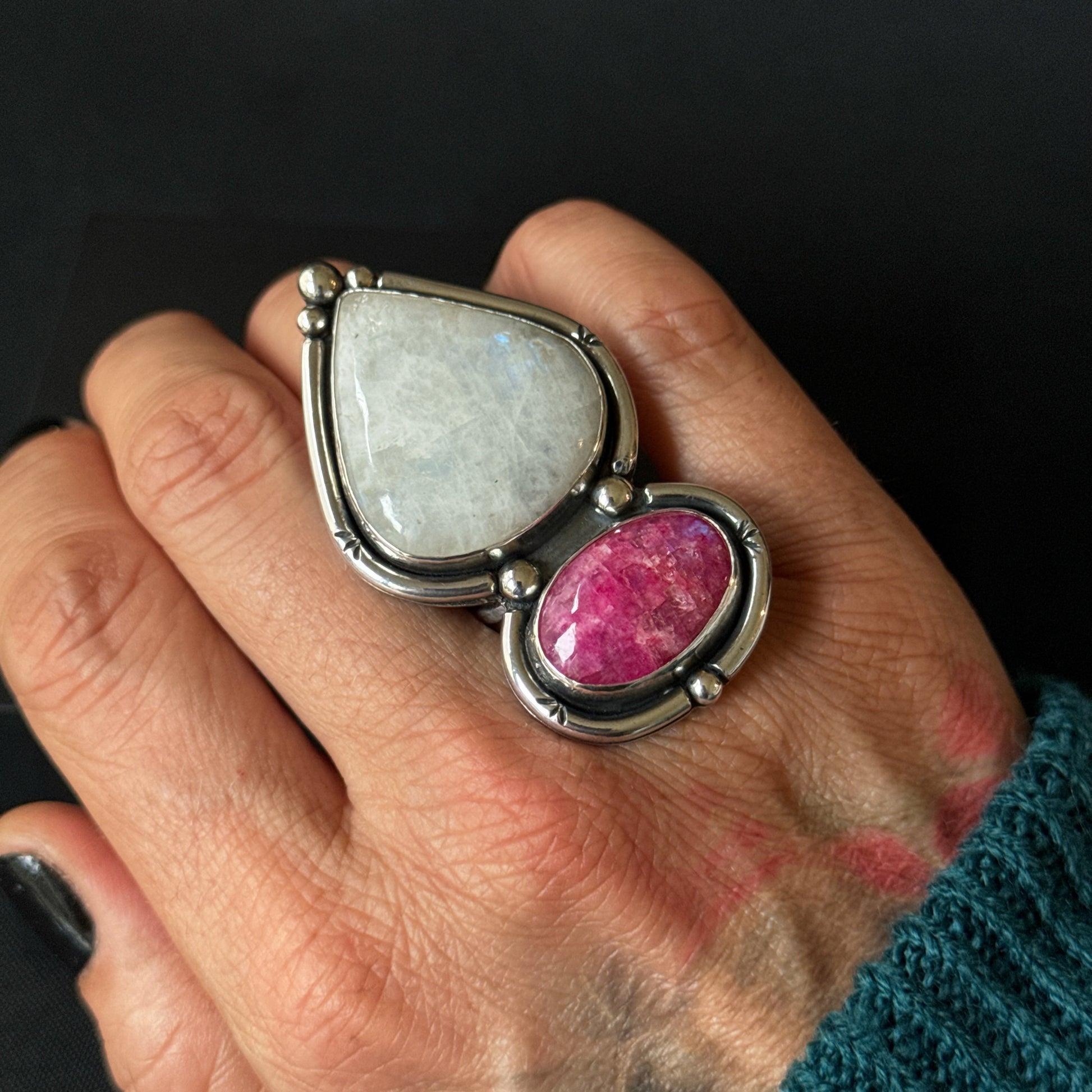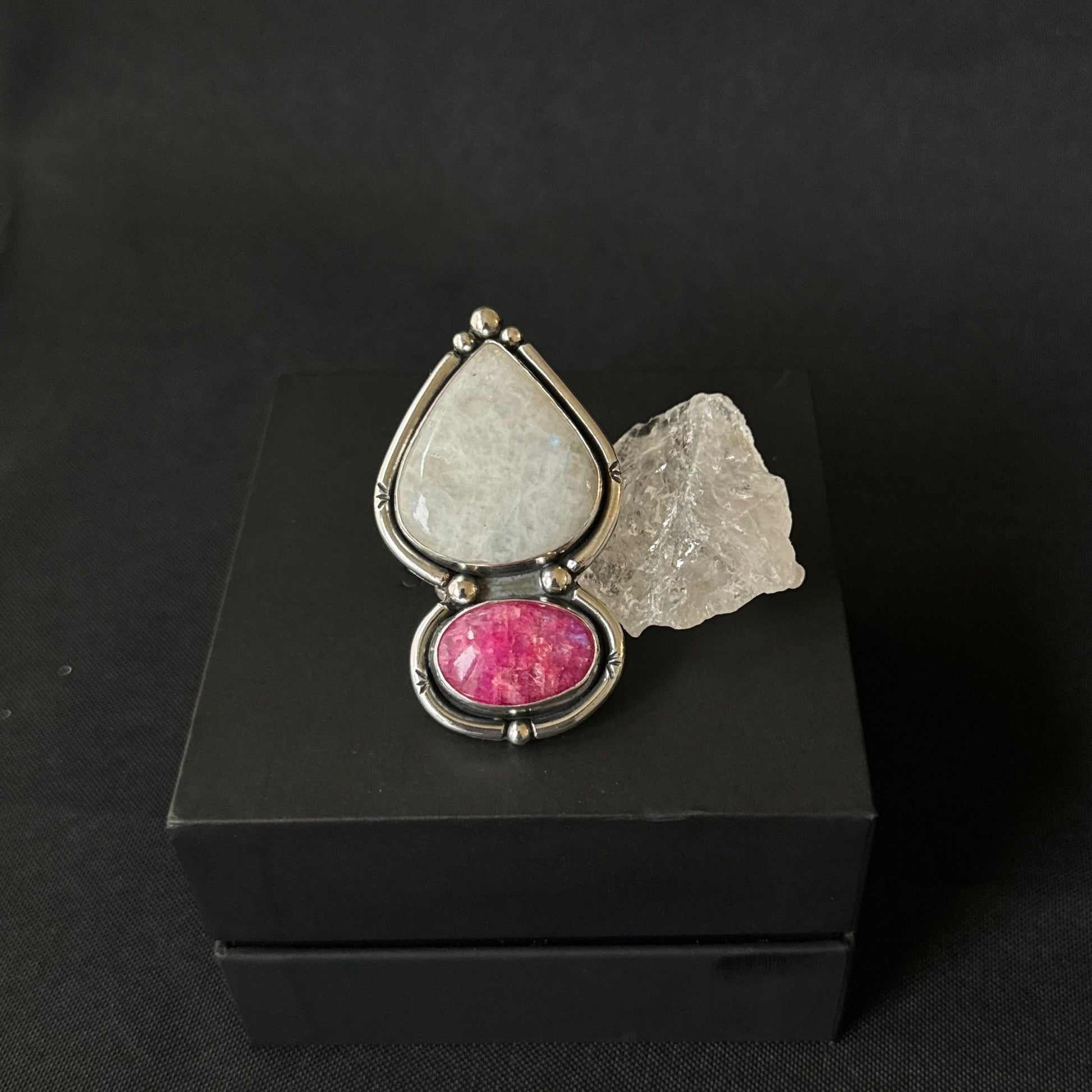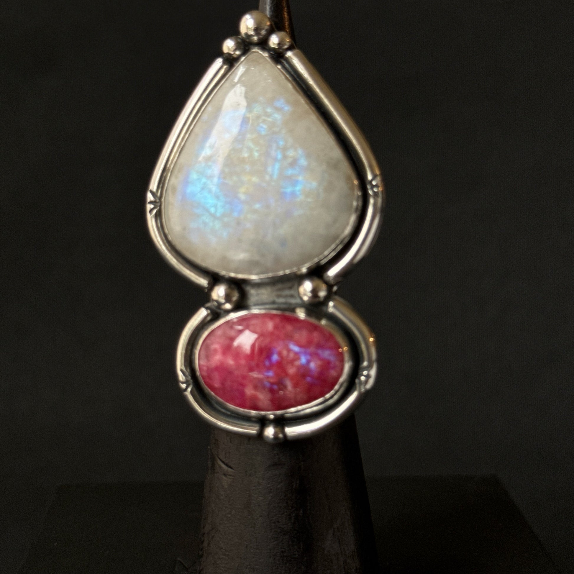 This stunning statement ring has two rainbow moonstones, one coloured pink. Set in sterling and fine silver with embellishments around the stones. It has a triple ring band with a hammered finish.