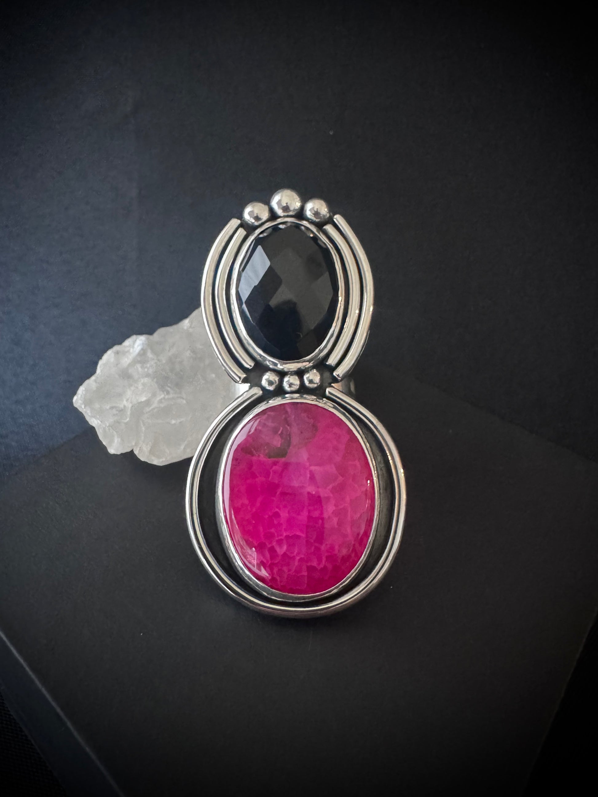 This beautiful double stone statement ring has a faceted black onyx and pink dragon vein agate gemstone. Set in sterling and fine silver with embellishments around the stones.