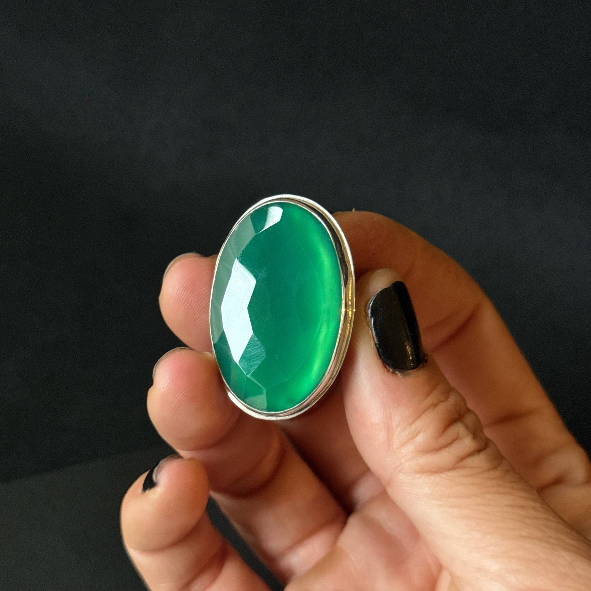 Faceted Green Onyx Sterling Silver Ring - Size R