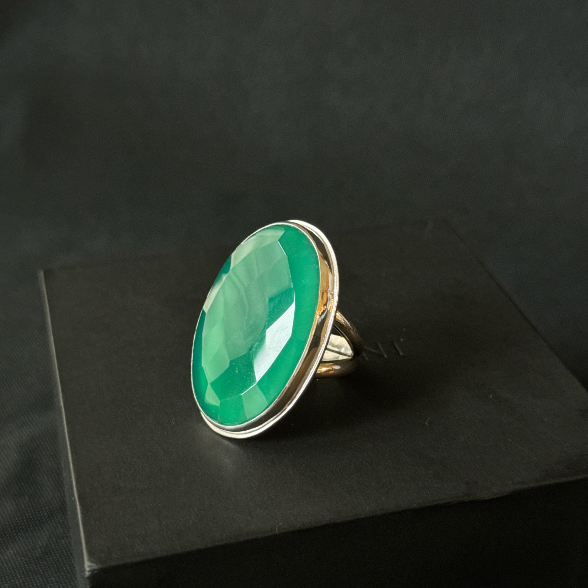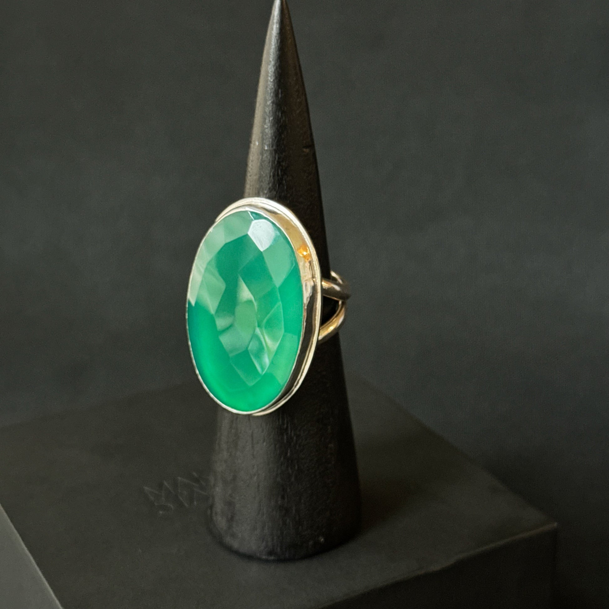 This pretty ring has an oval faceted green onyx stone set in sterling and fine silver with a double ring band.