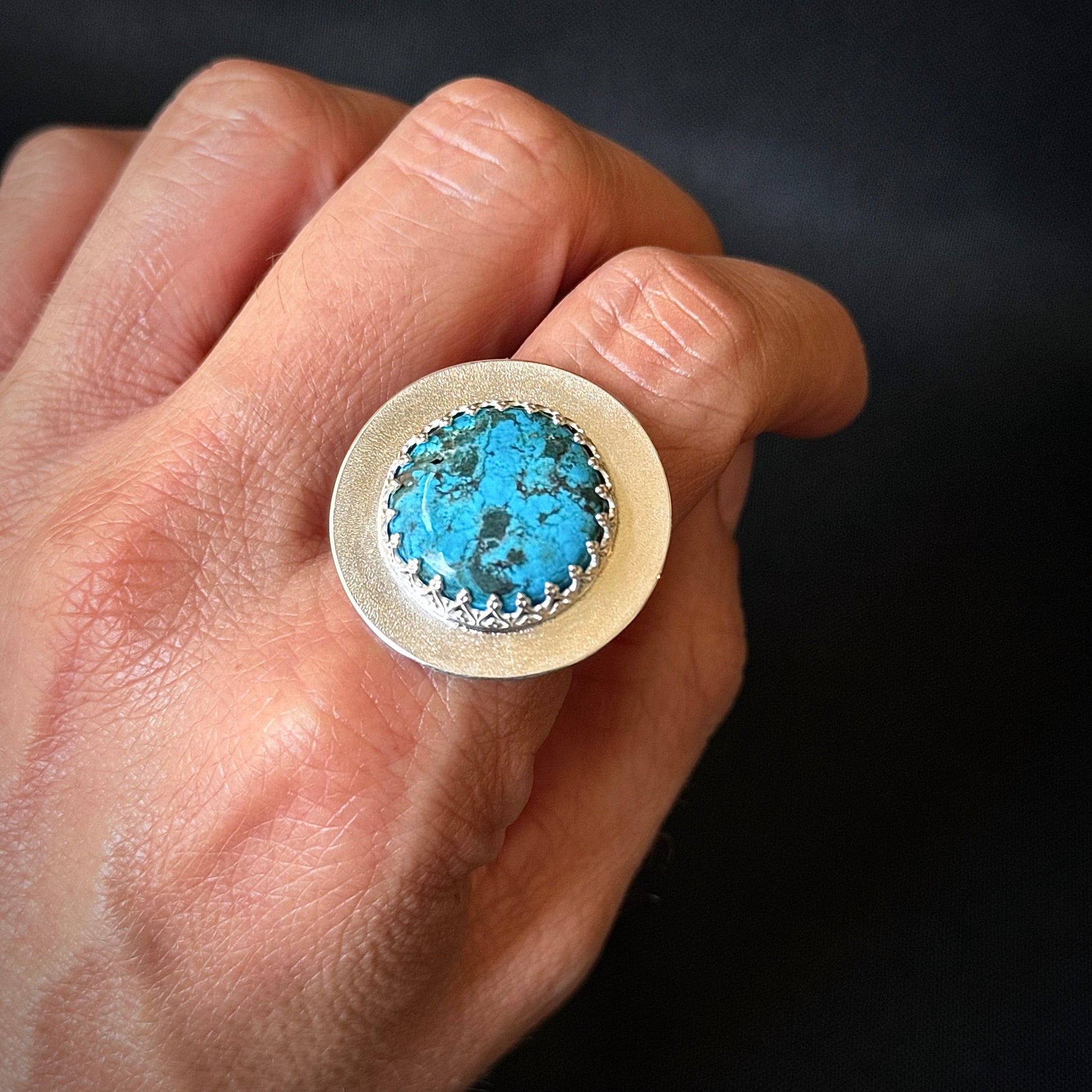 This ring has a beautiful turquoise stone wrapped in decorative silver on top of a brushed textured sterling silver plate.