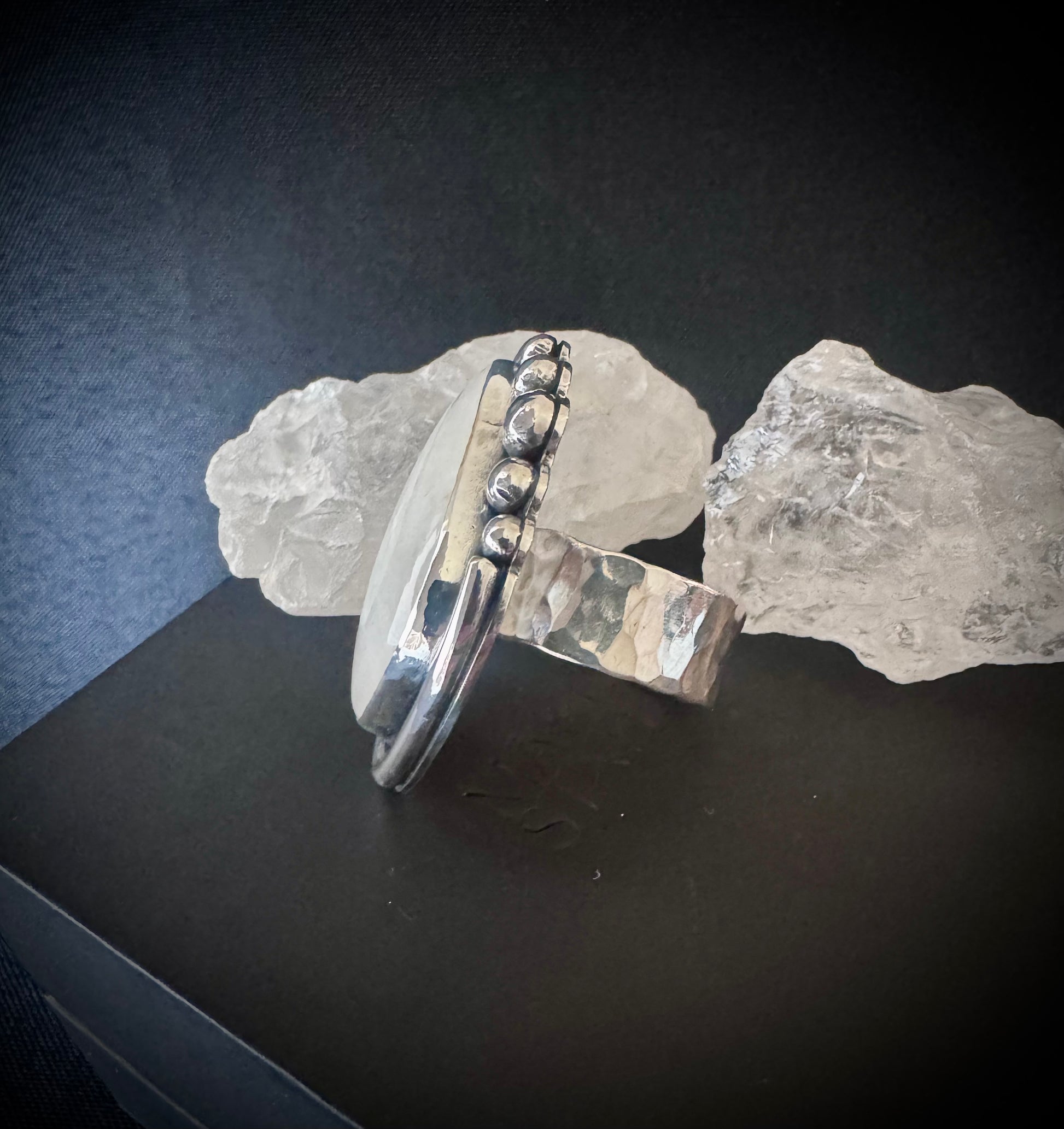 This statement ring has a beautiful rainbow moonstone gemstone set in sterling and fine silver. It has a hammered textured ring band.