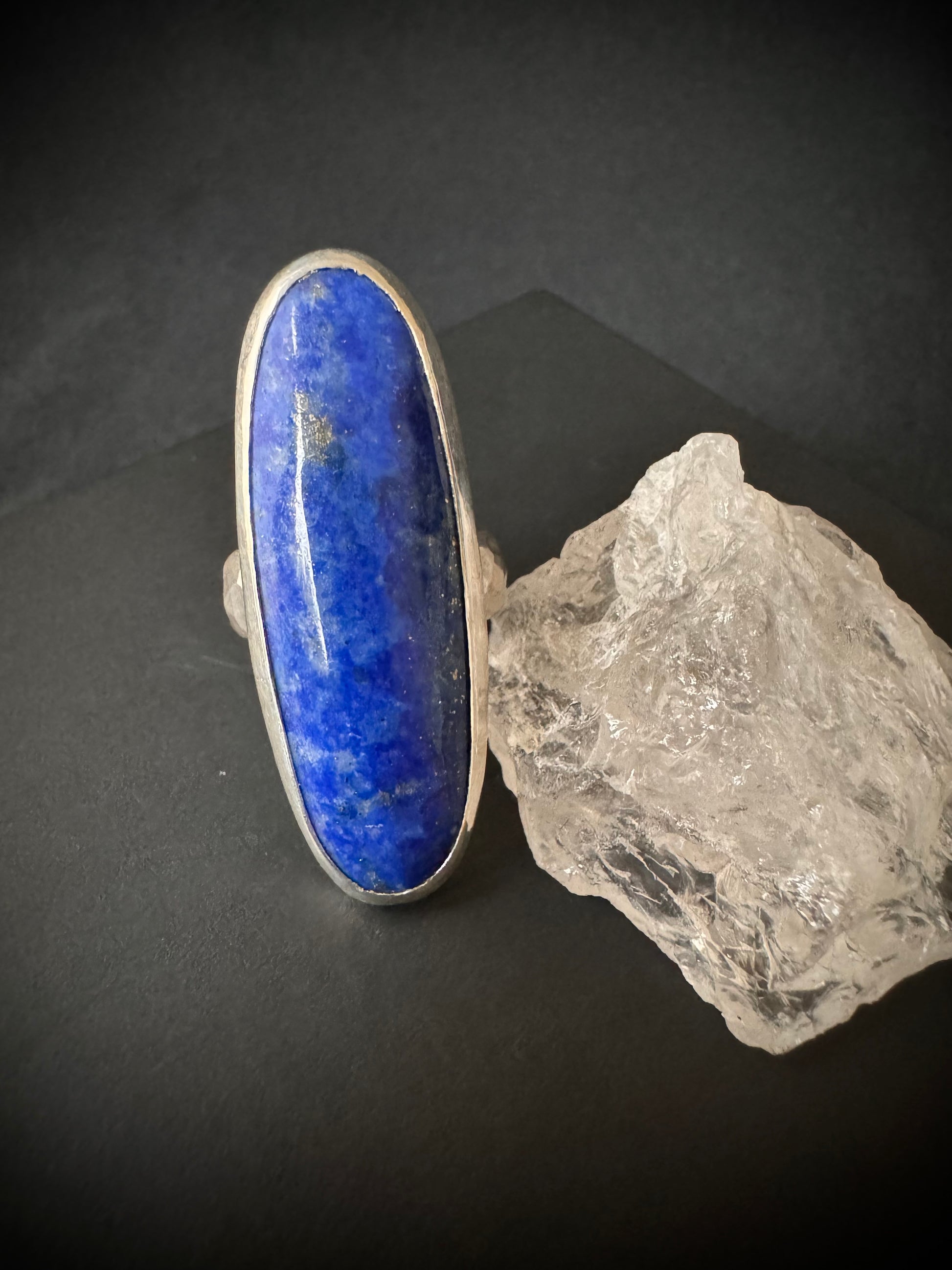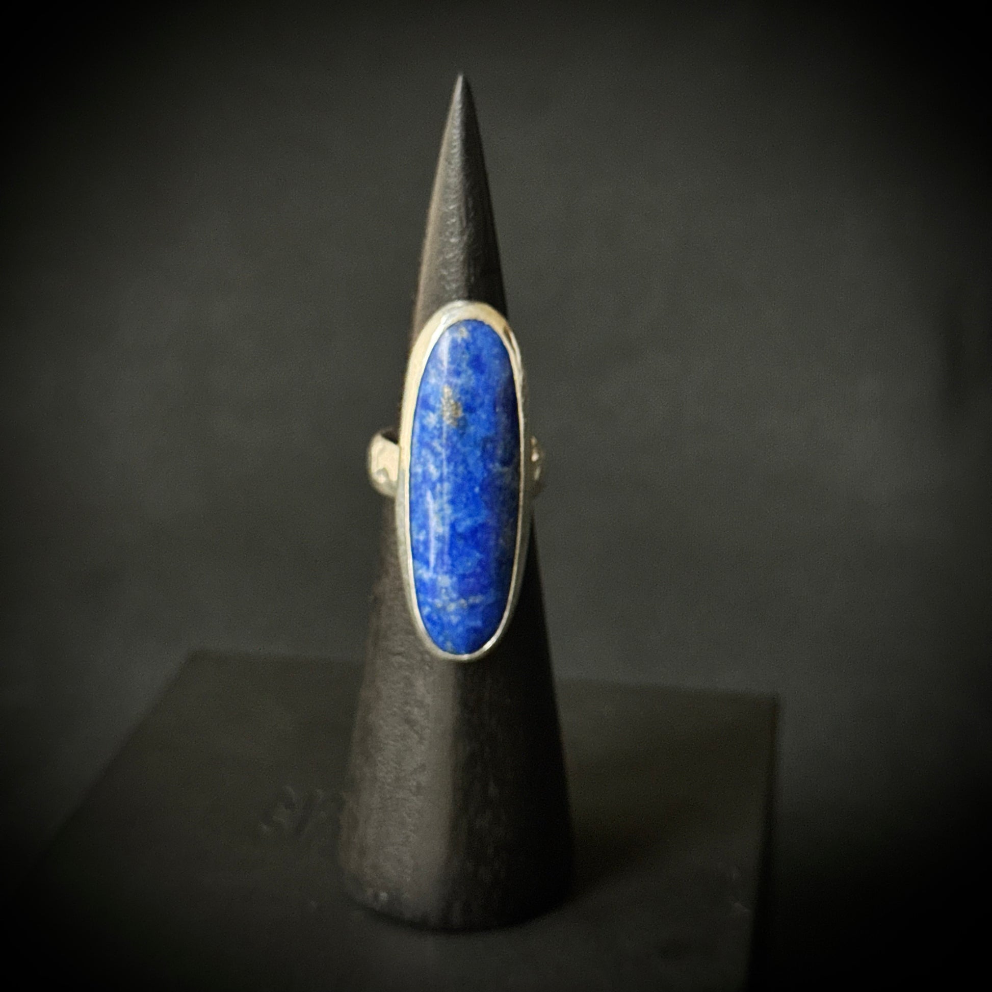 This striking statement ring has a lapis lazuli gemstone set in sterling and fine silver. It has a hammered textured ring band.