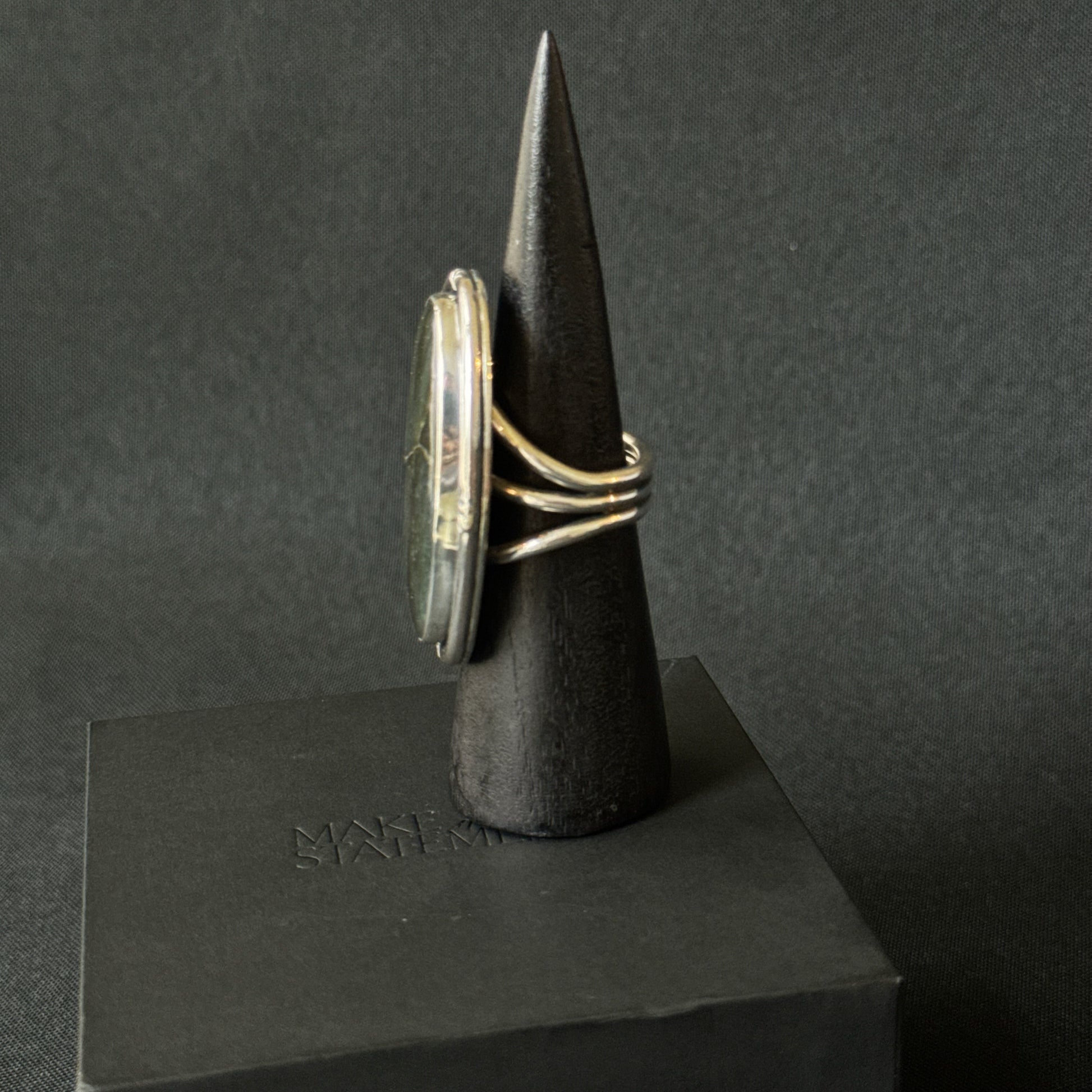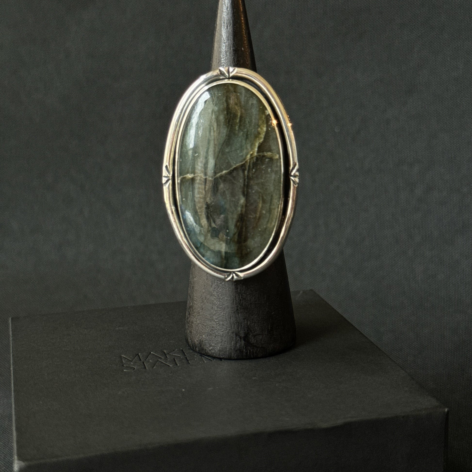 This stunning labradorite stone ring has beautiful split flash of colours. Set in sterling and fine silver.