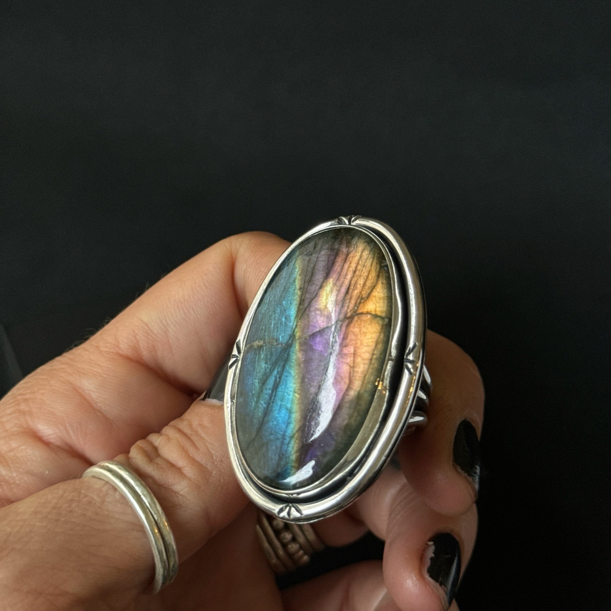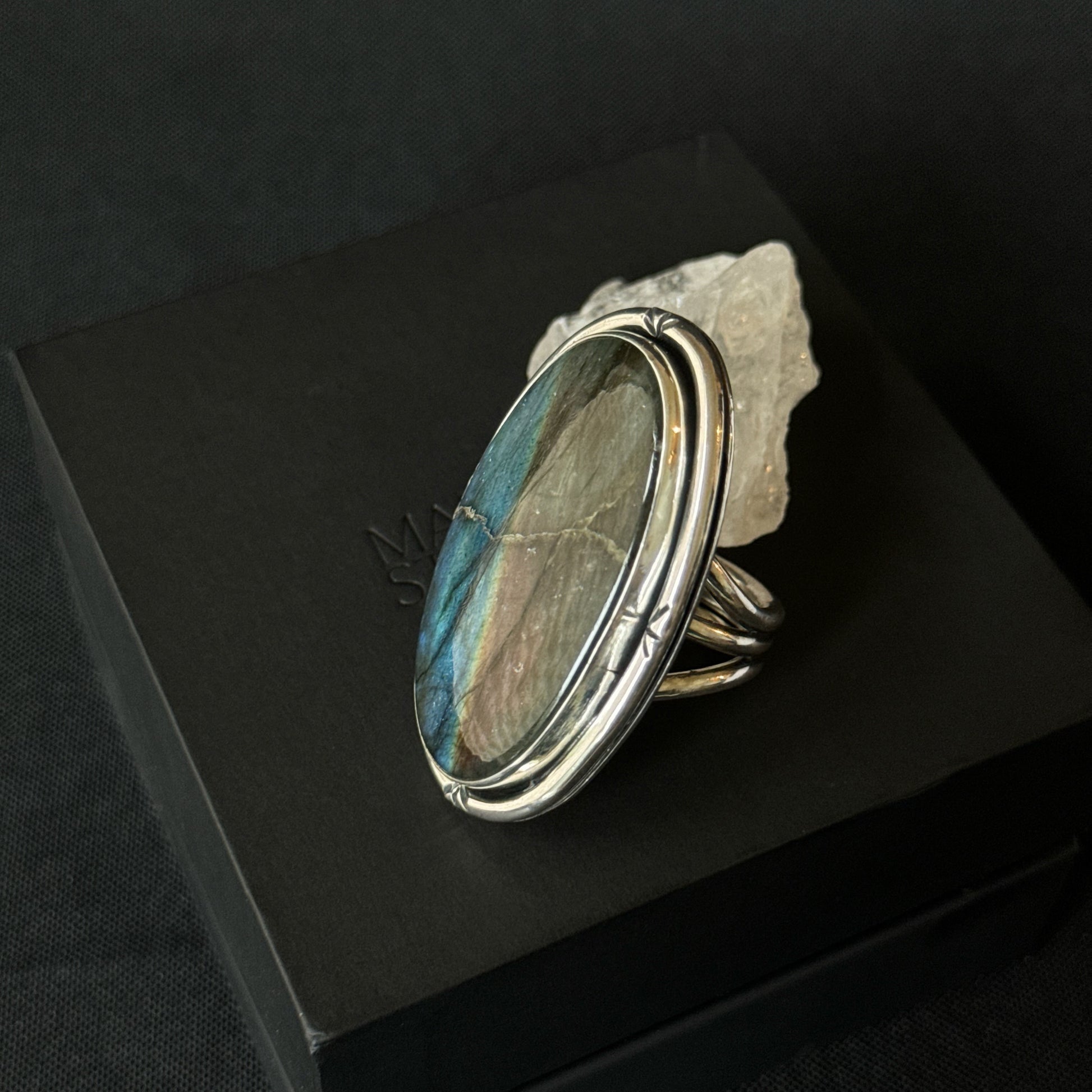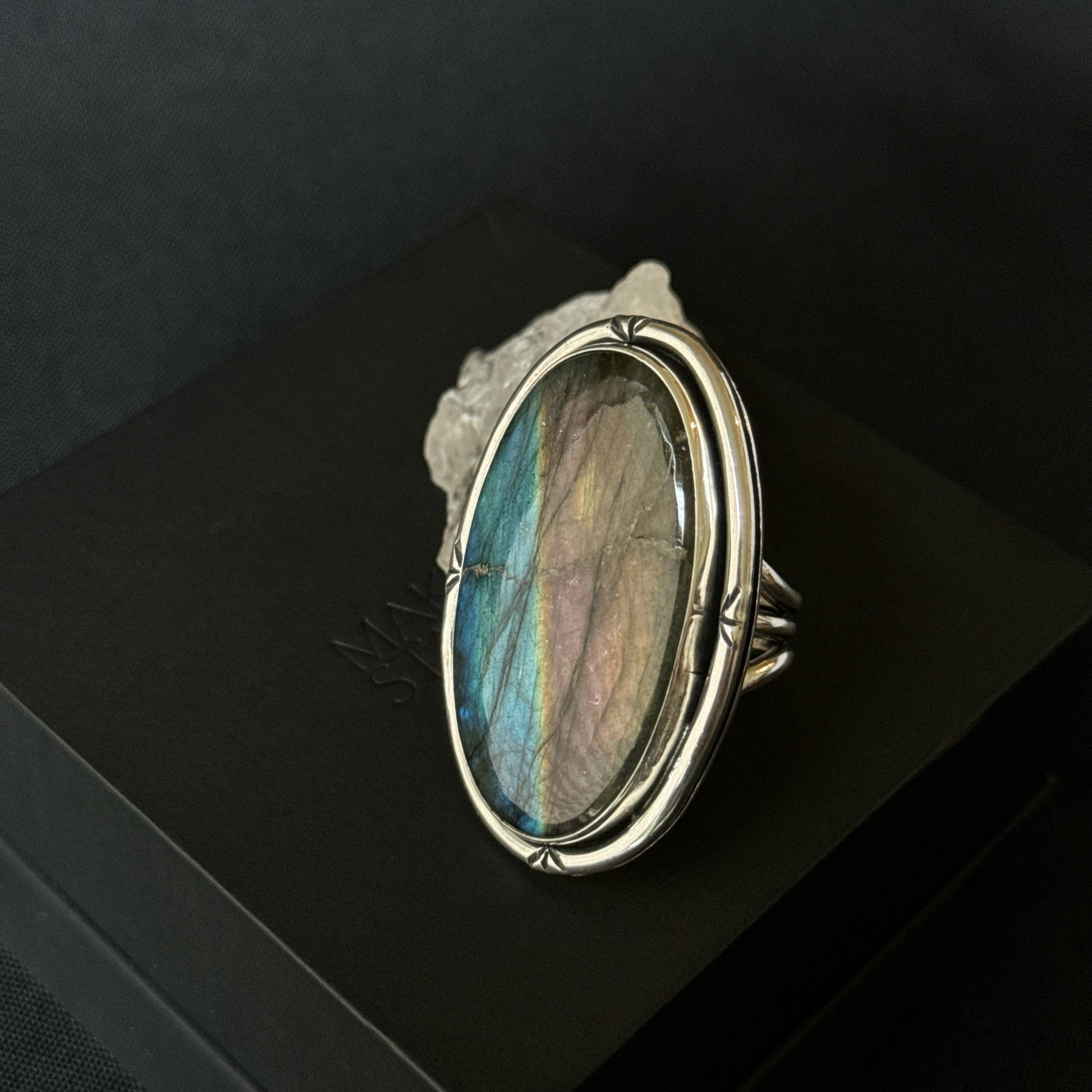 Large Oval Multi Flash Labradorite Sterling Silver Ring - Size S