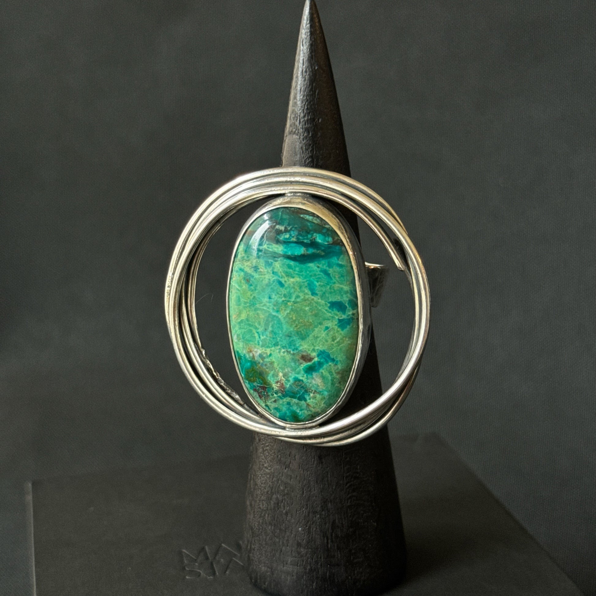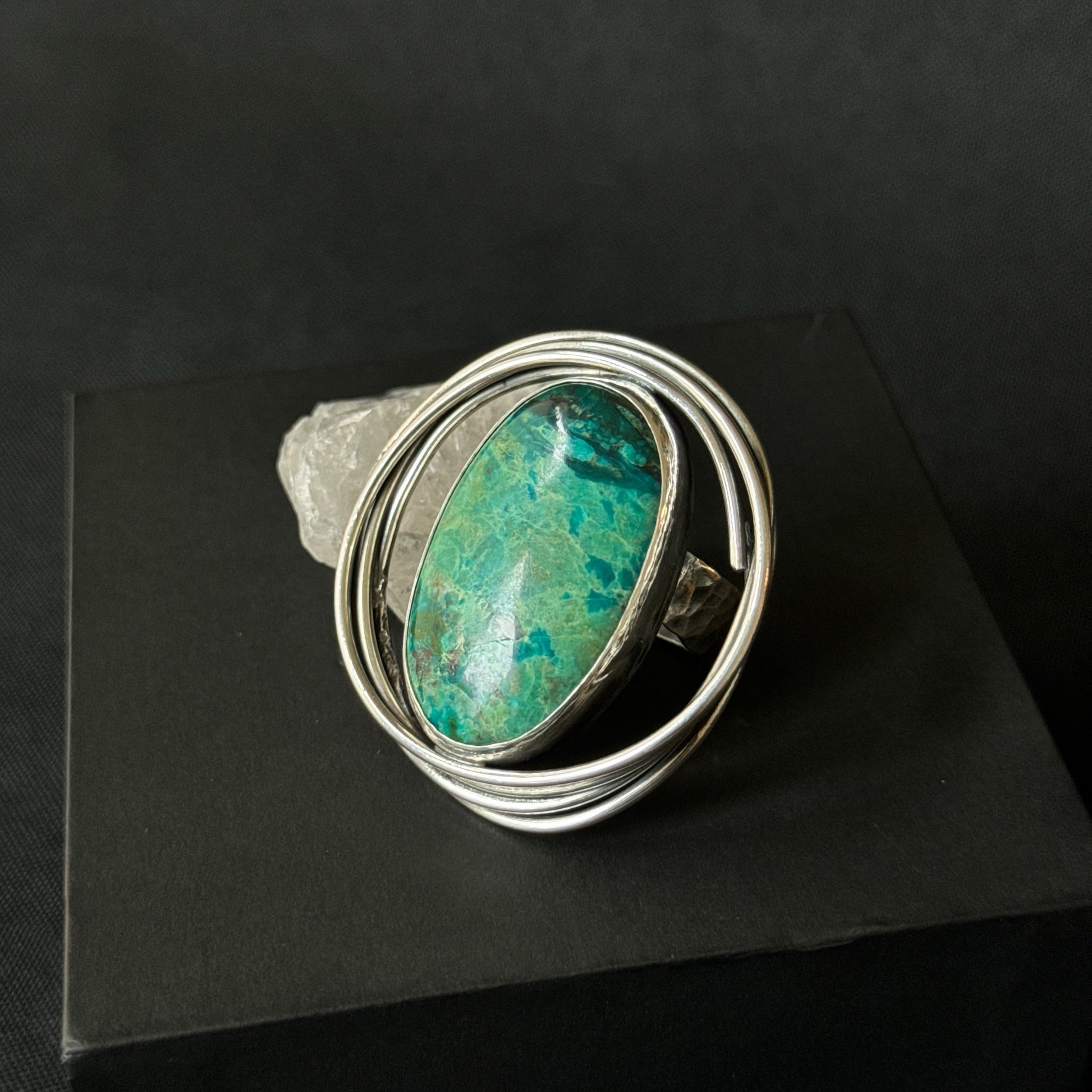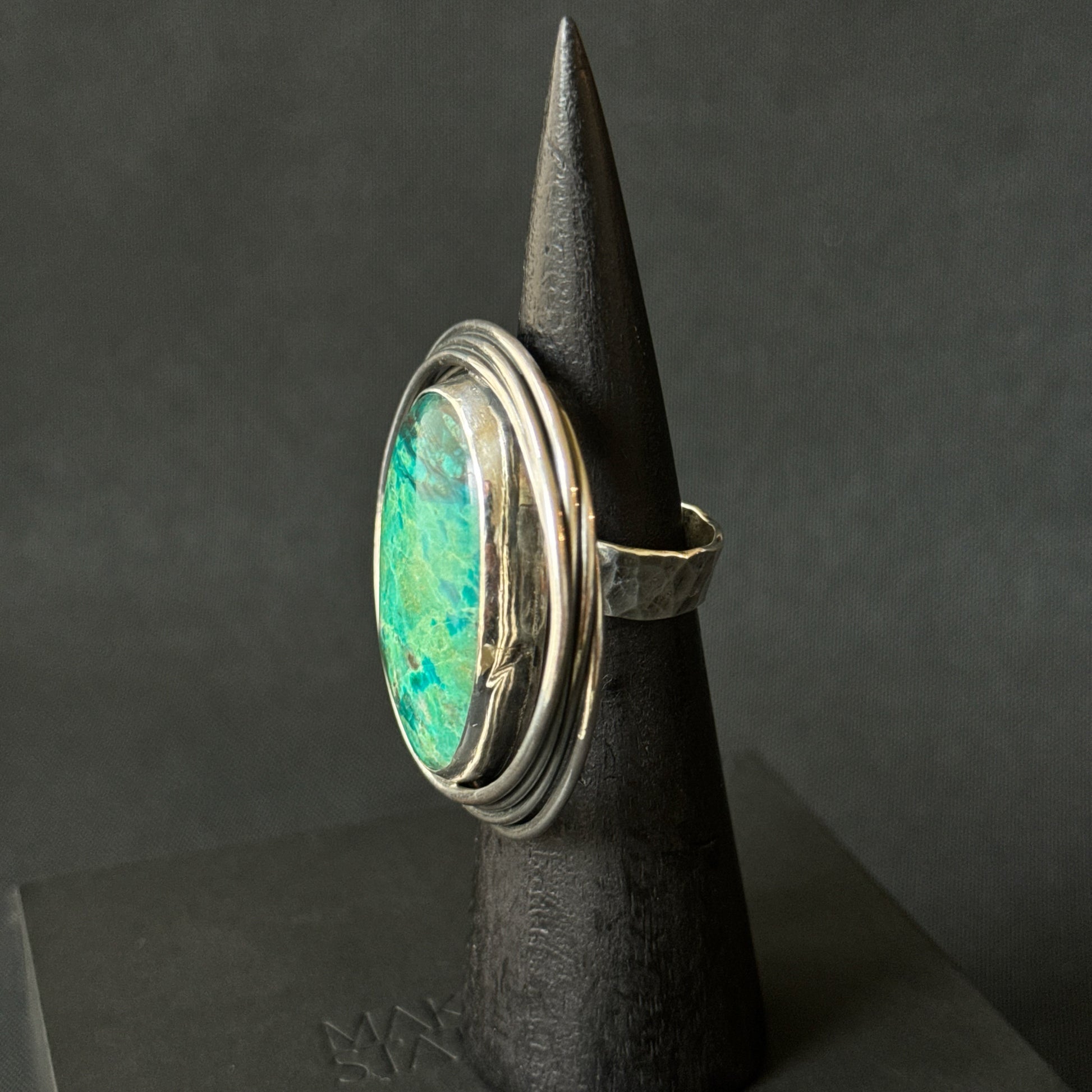 This statement ring has an oval chrysocolla stone with oxidised sterling silver wrapped around. The ring band has a hammered twisted finish.