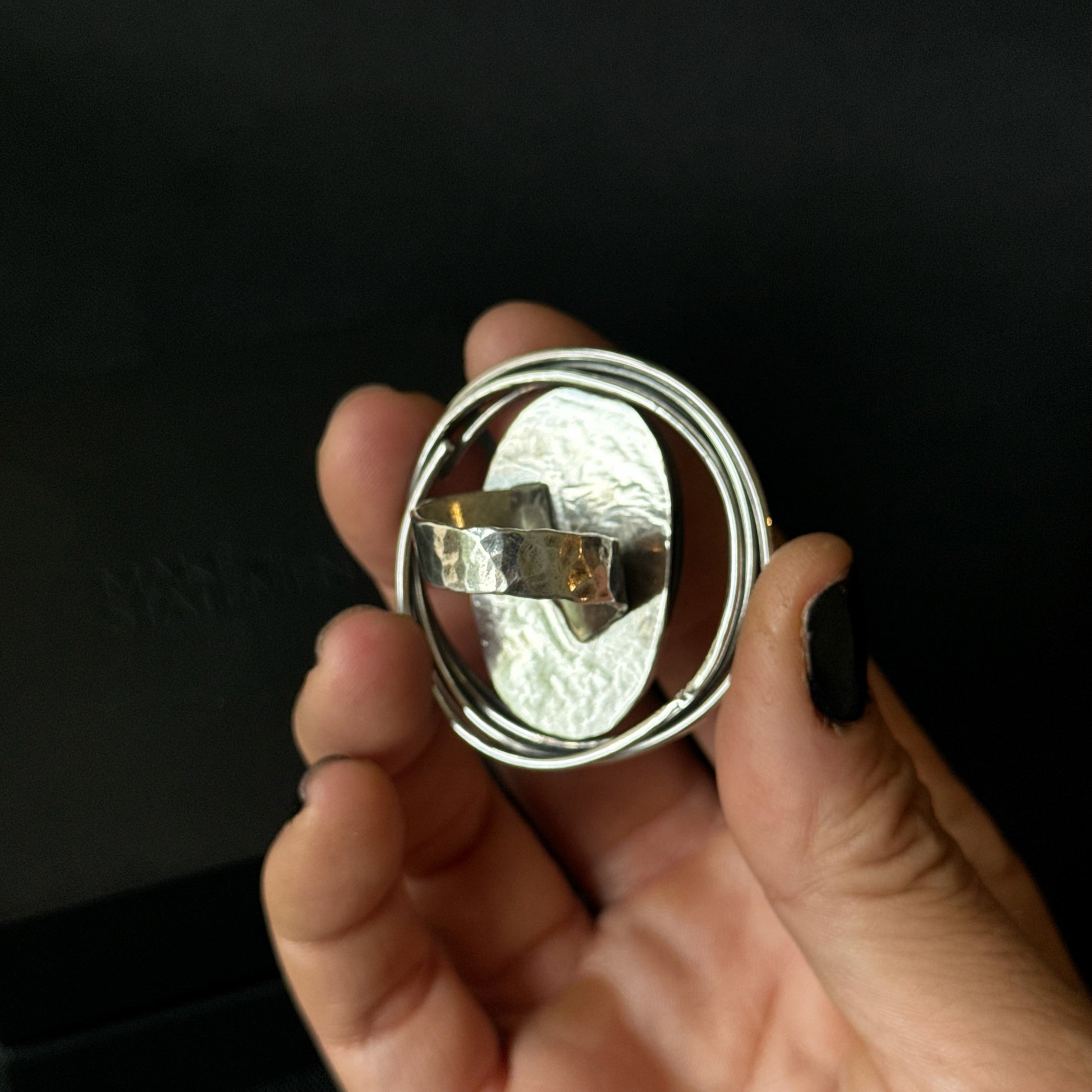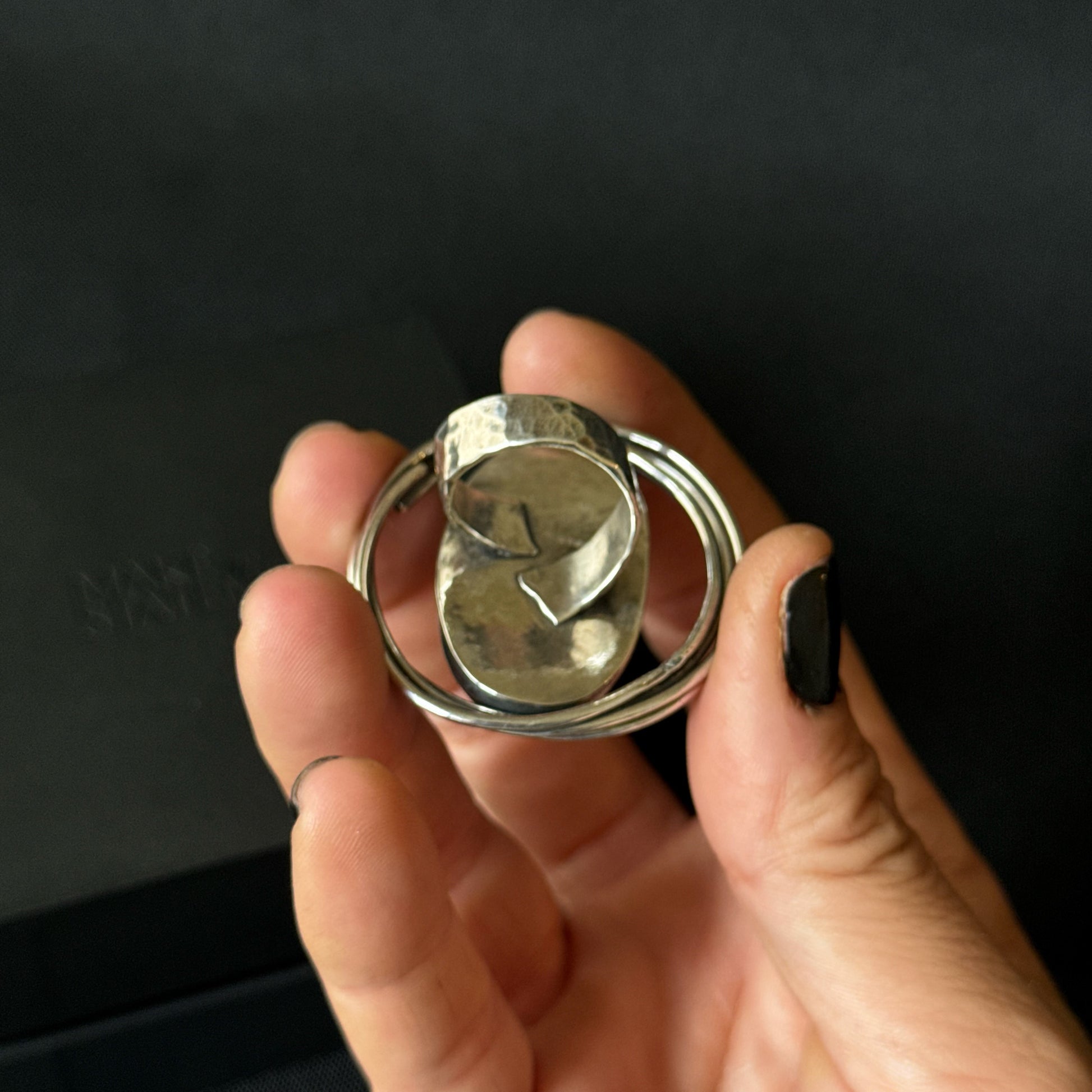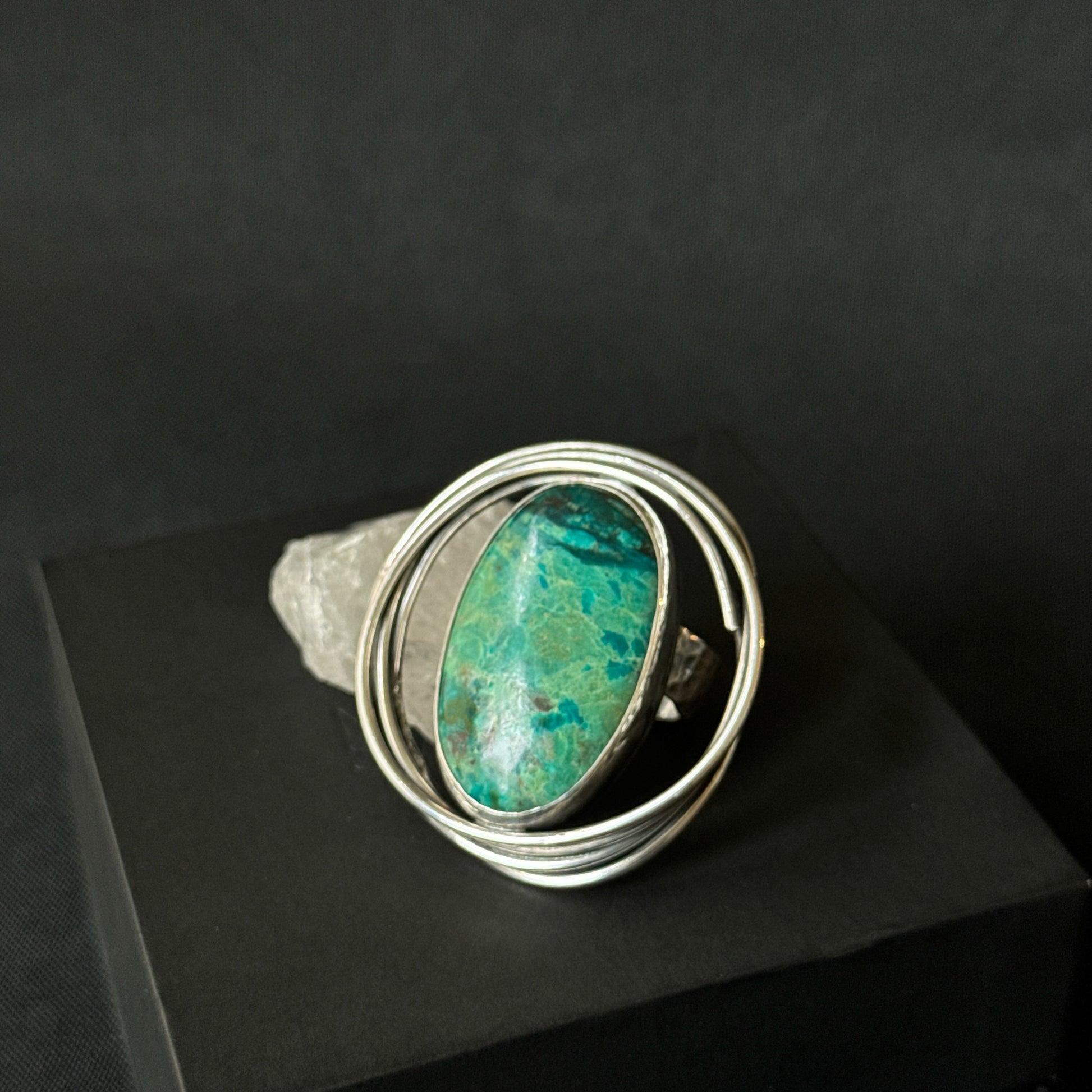 This statement ring has an oval chrysocolla stone with oxidised sterling silver wrapped around. The ring band has a hammered twisted finish.