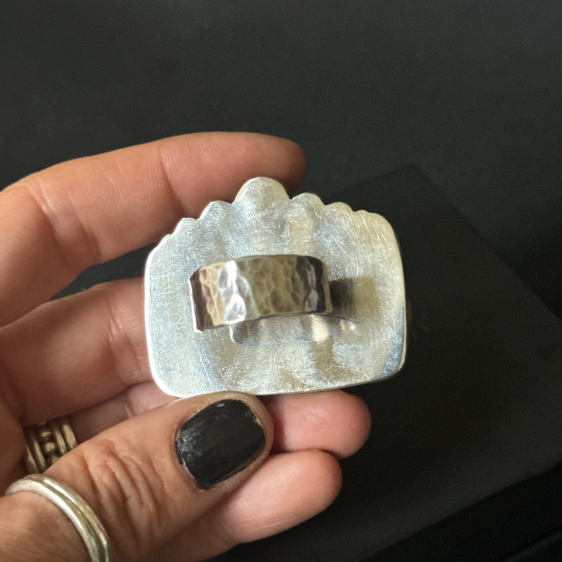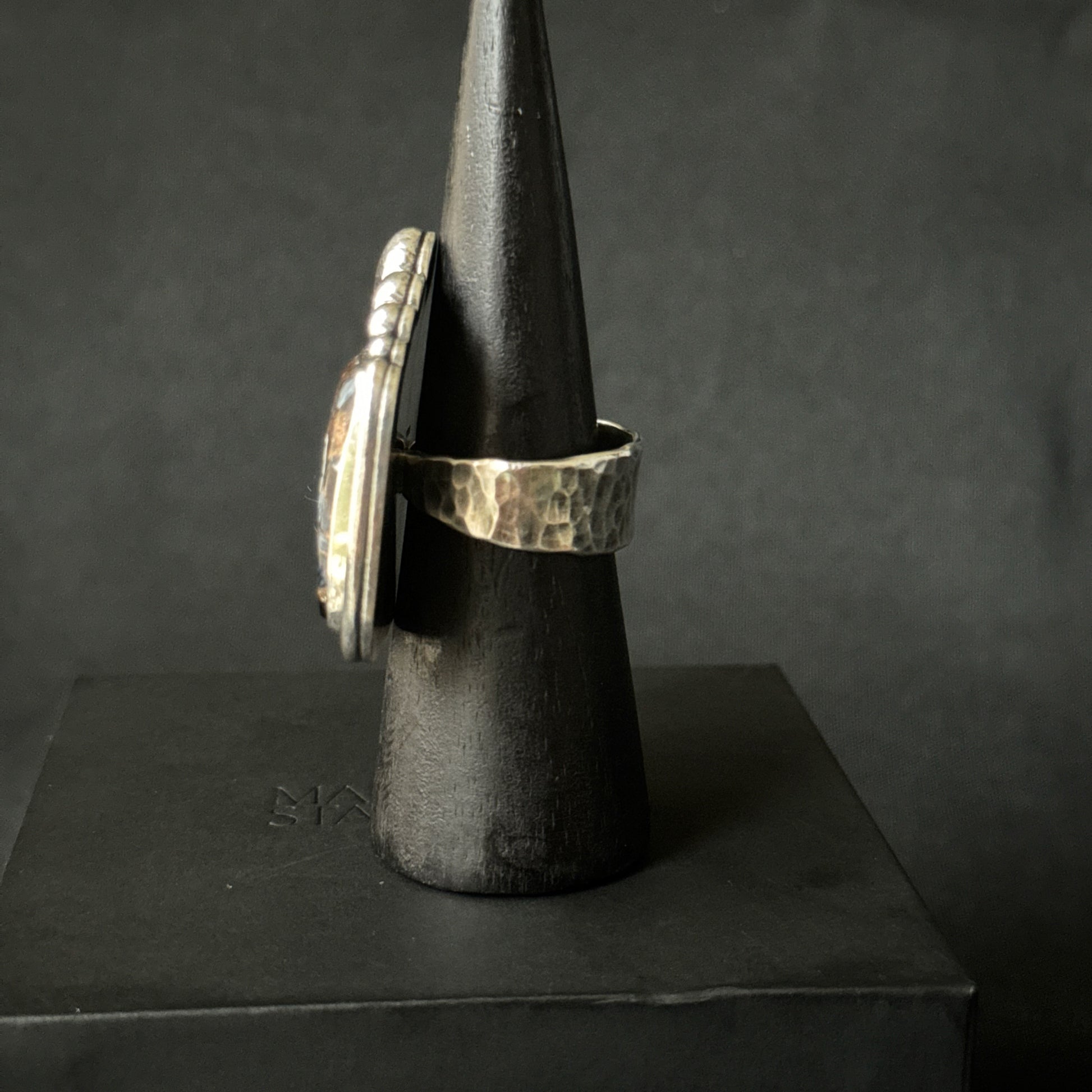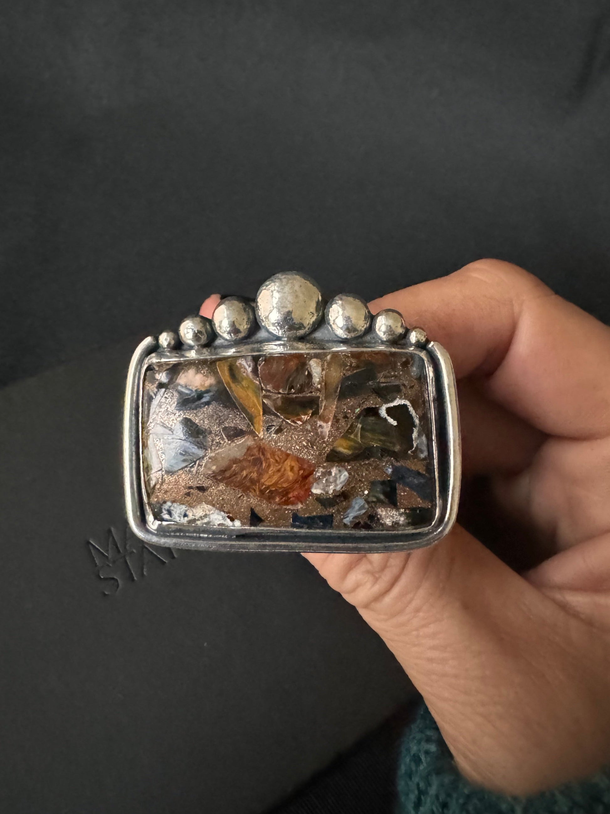 Large Pietersite Mosaic stone set in sterling and fine silver with embellishments with a oxidised hammered ring band.