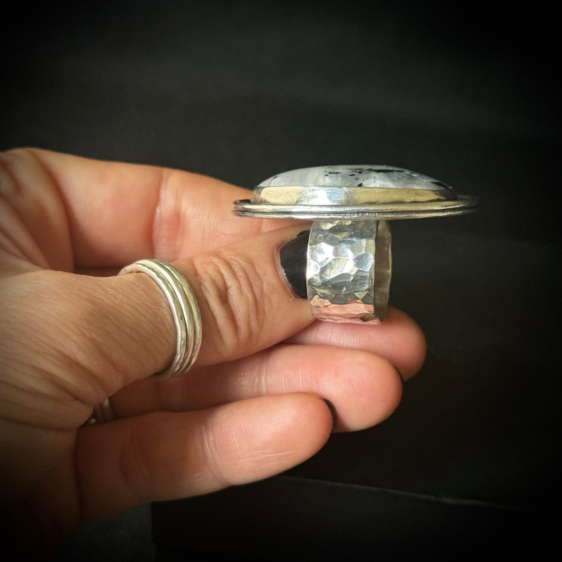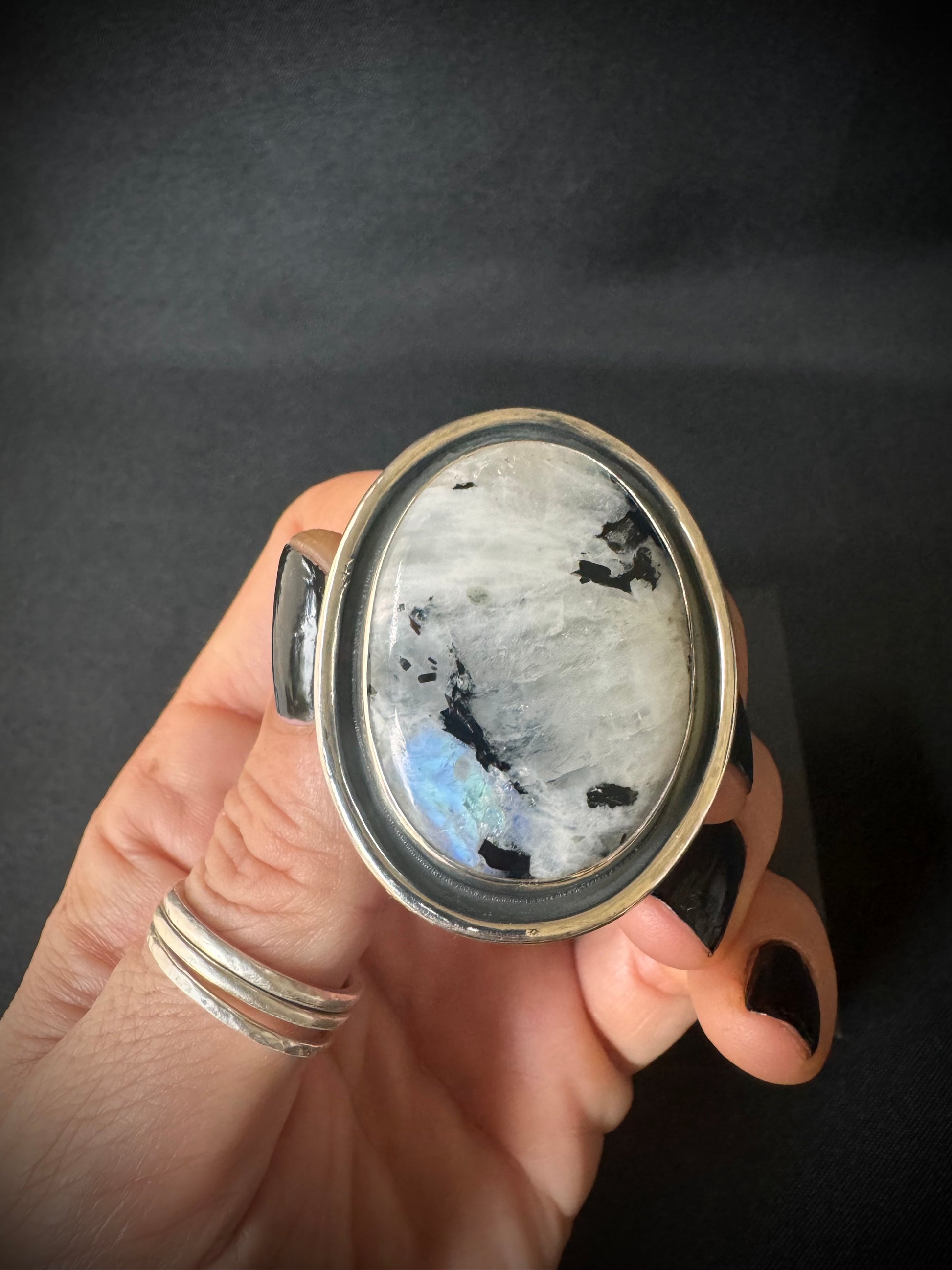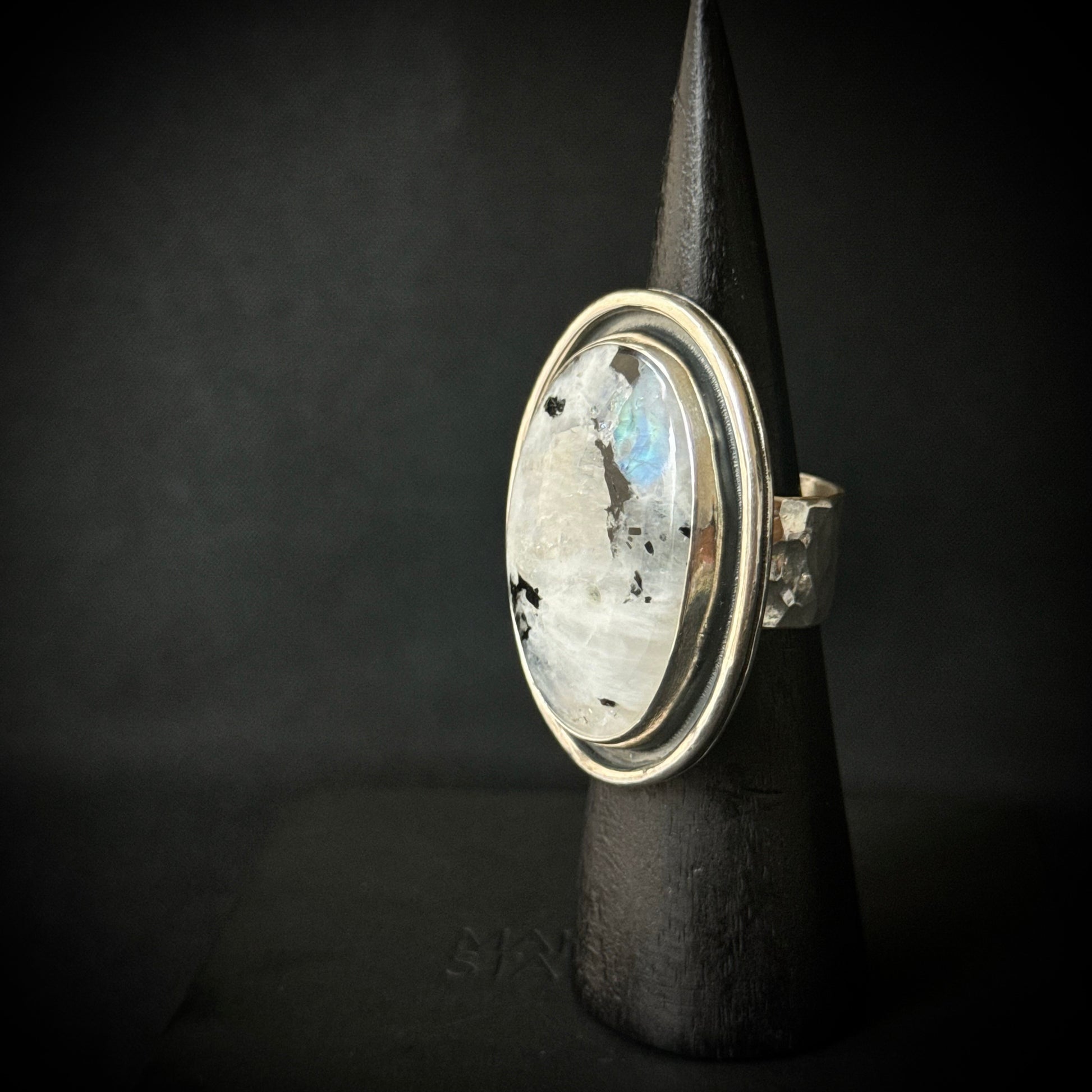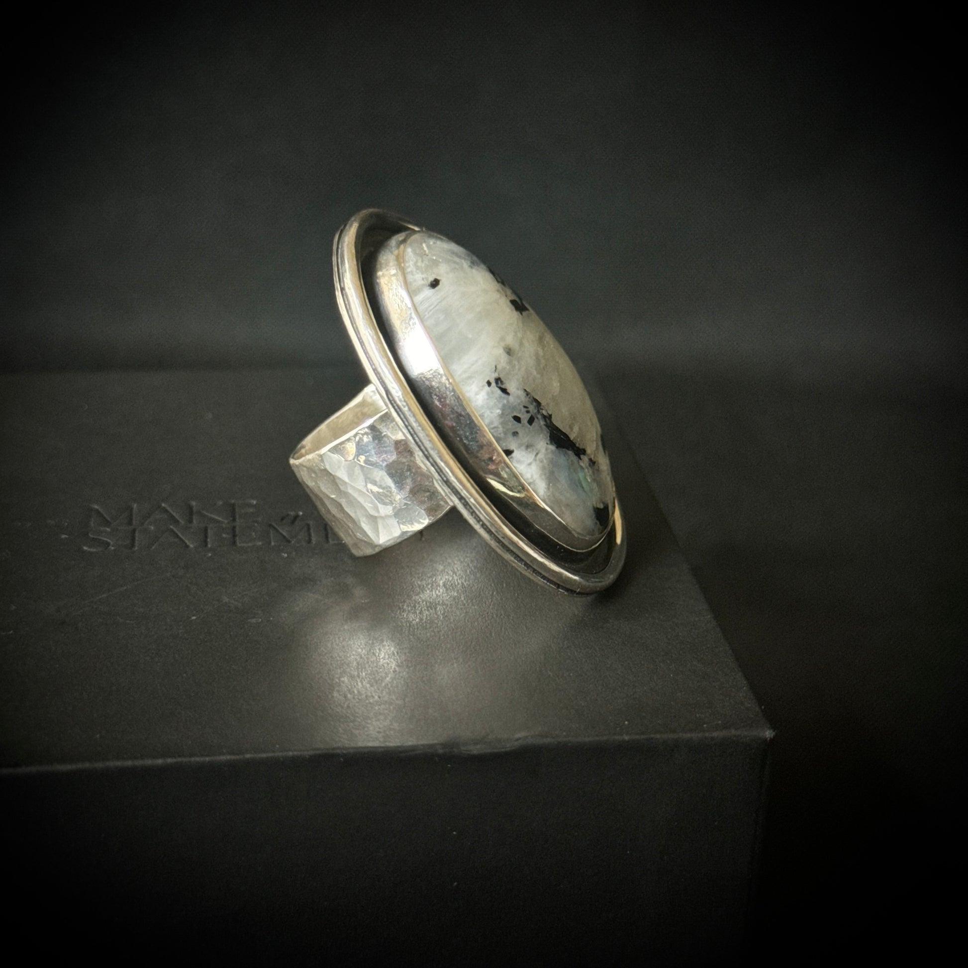 This statement ring has a large rainbow moonstone with black tourmaline gemstone set in sterling and fine silver. It has a wide hammered textured ring band.