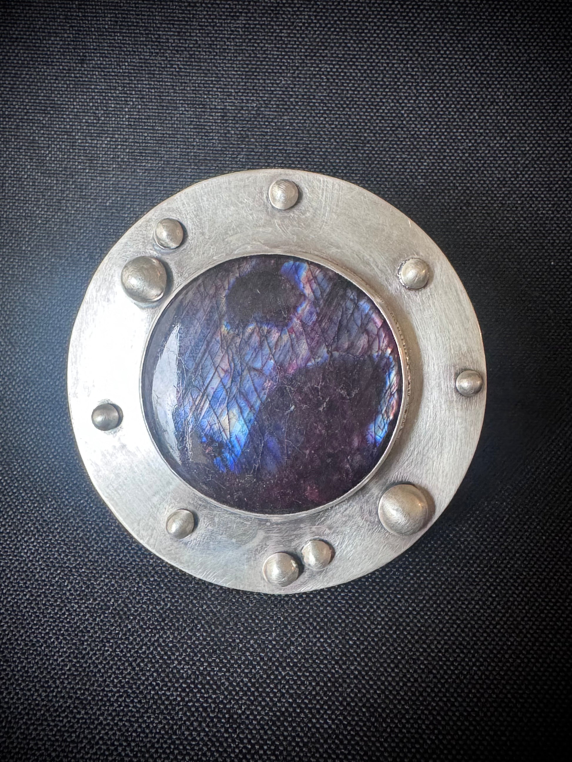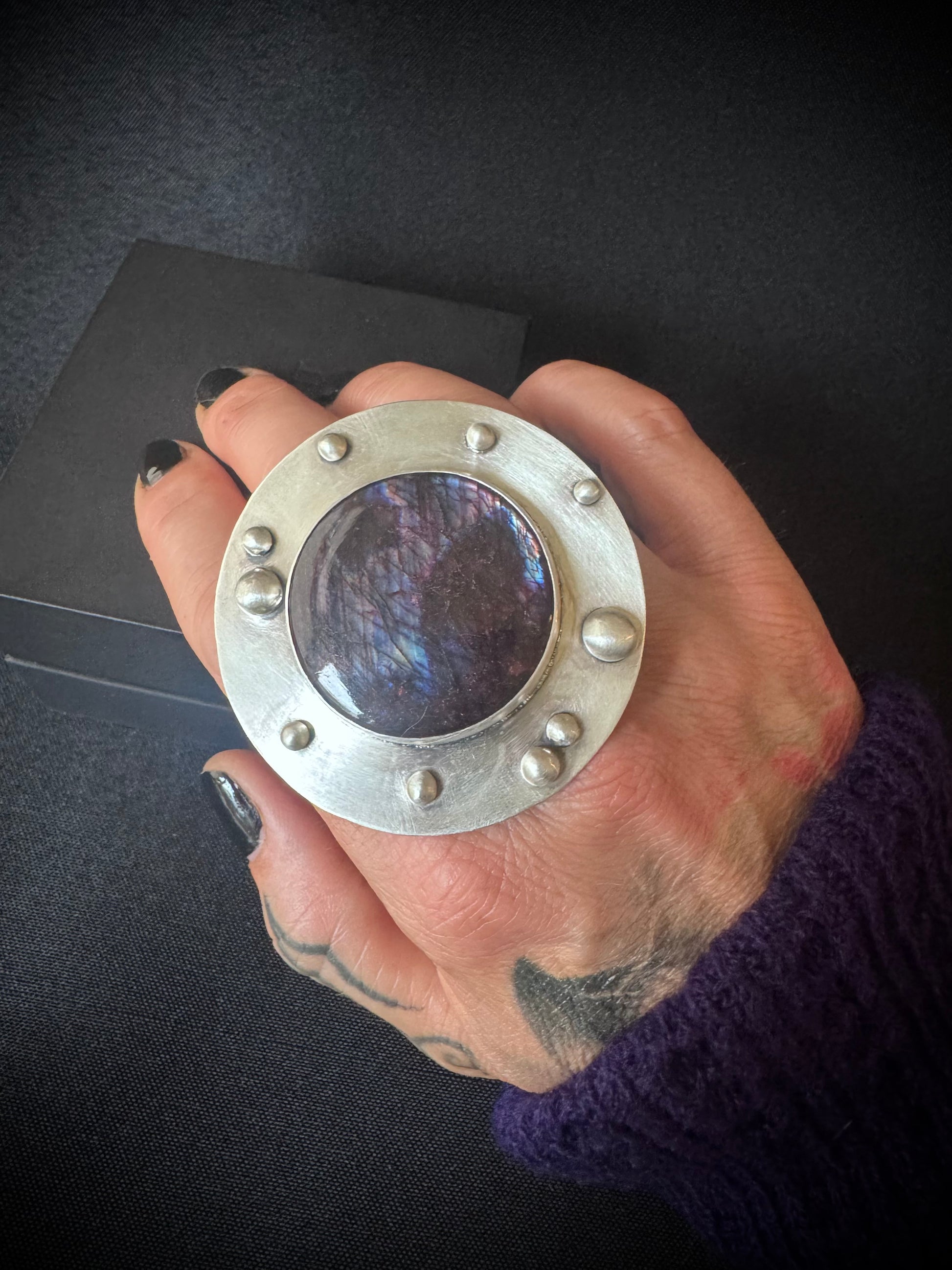 This stunning statement ring has a large round spectrolite gemstone. Surrounded by sterling silver plate and ball embellishments and set in sterling and fine silver. It has a wide ring band and a satin finish.