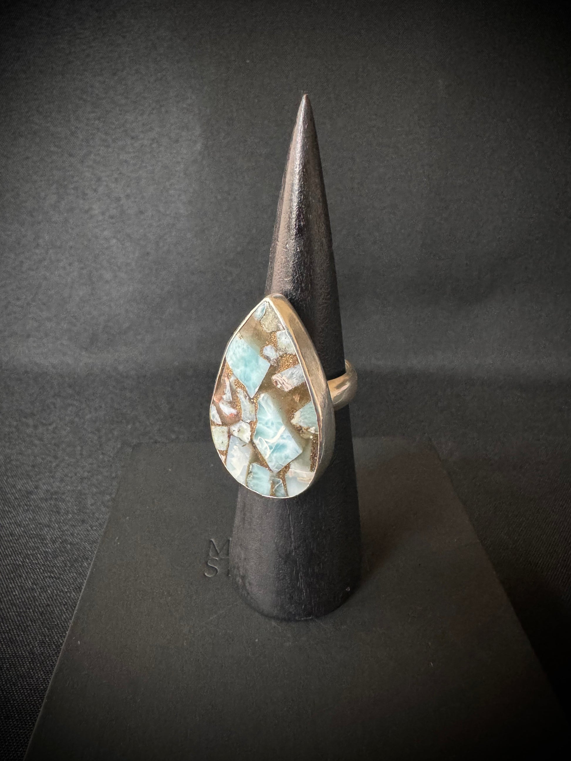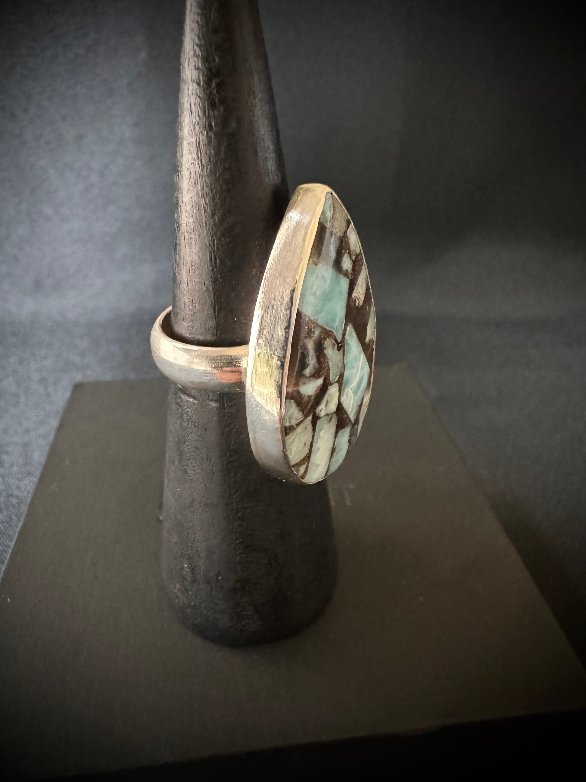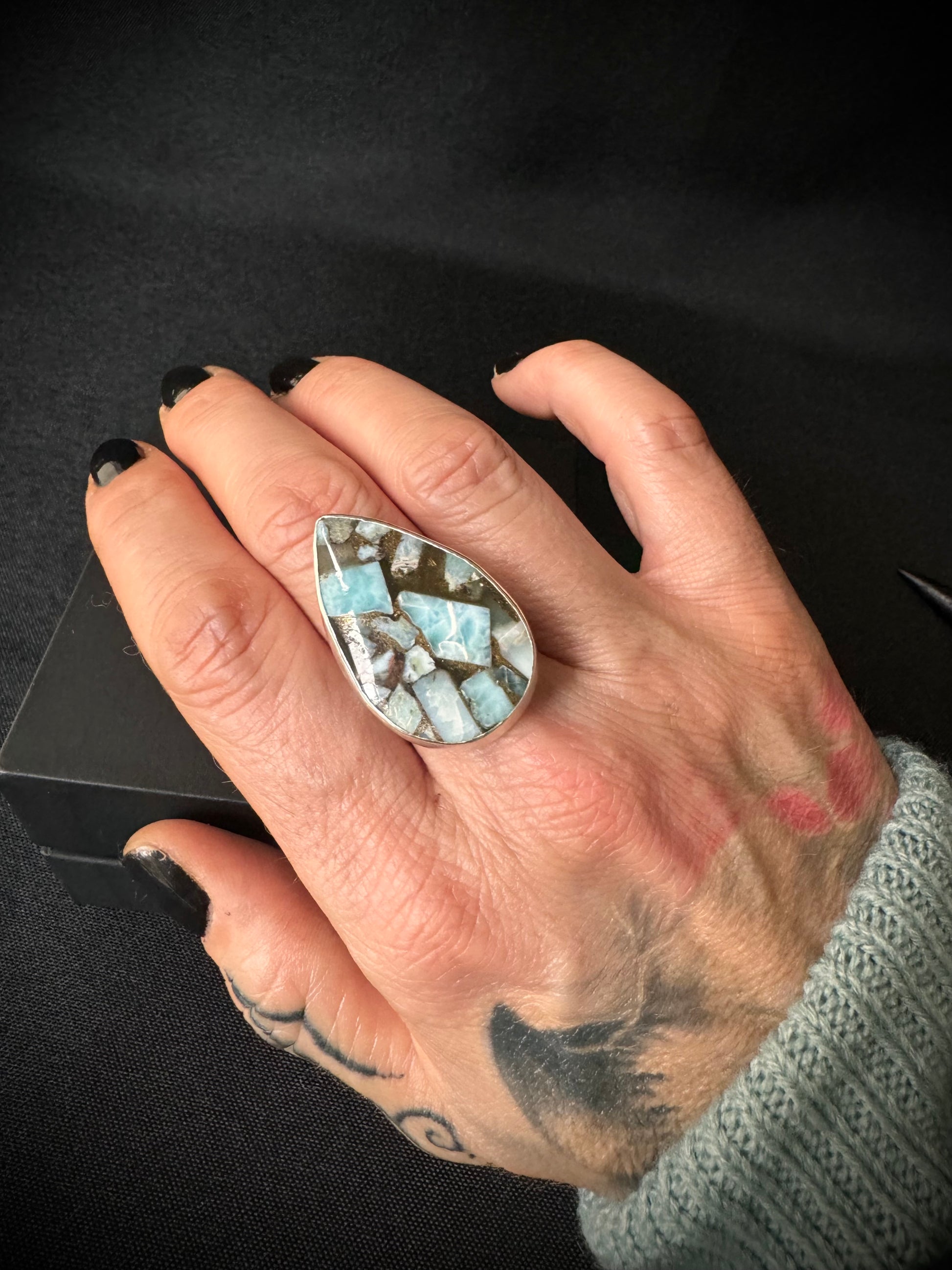 This unique statement ring has a larimar mosaic gemstone set in sterling and fine silver.