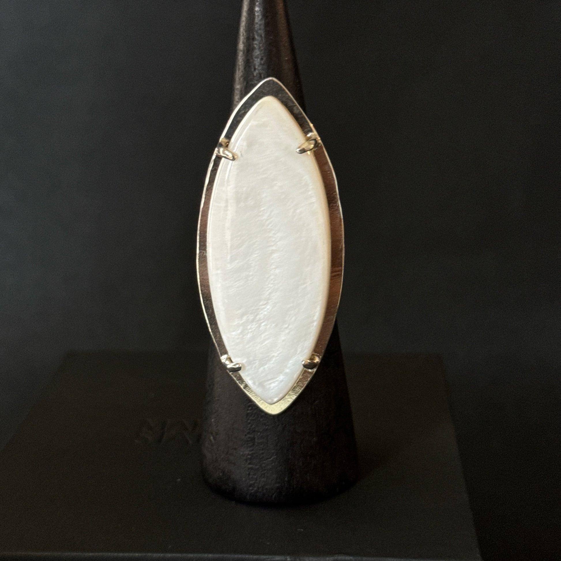 This beautiful ring has a marquis shaped mother of pearl stone set in sterling silver with a claw setting. The ring band has a hammered finish.