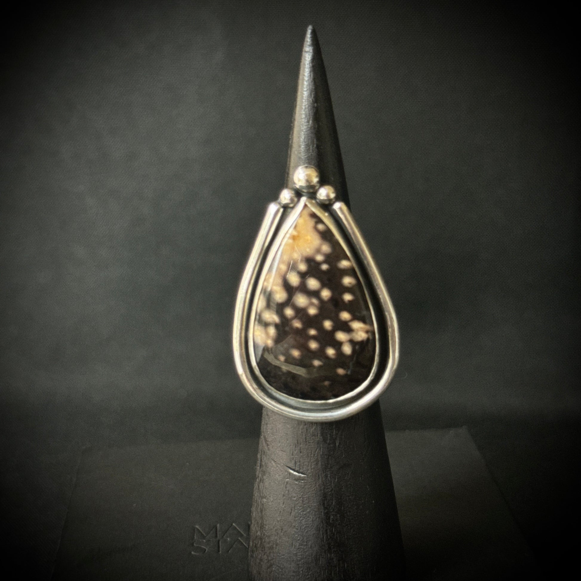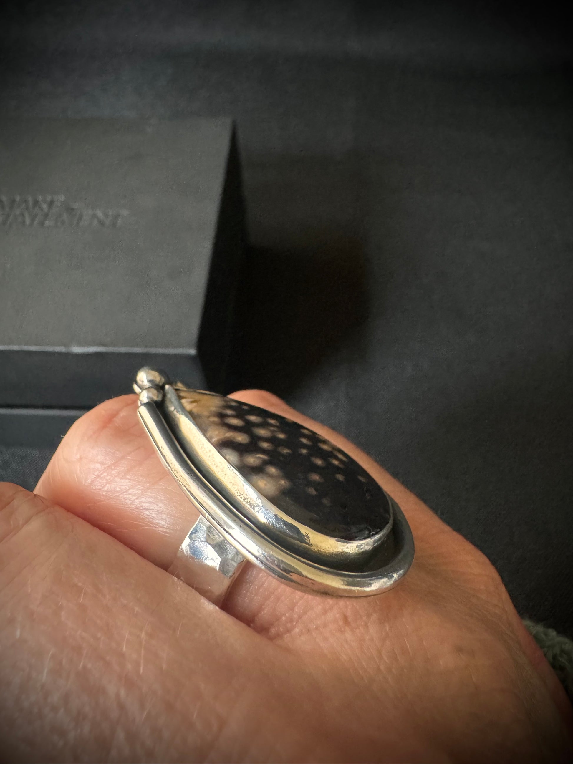 This unusual statement ring has a palm root gemstone set in sterling and fine silver.