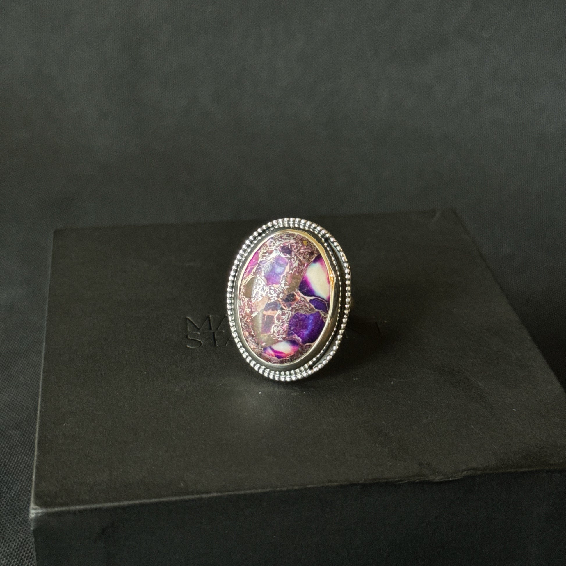 This unique oval purple imperial jasper stone is set in sterling and fine silver with beaded oxidisation detail and a D shaped ring band.