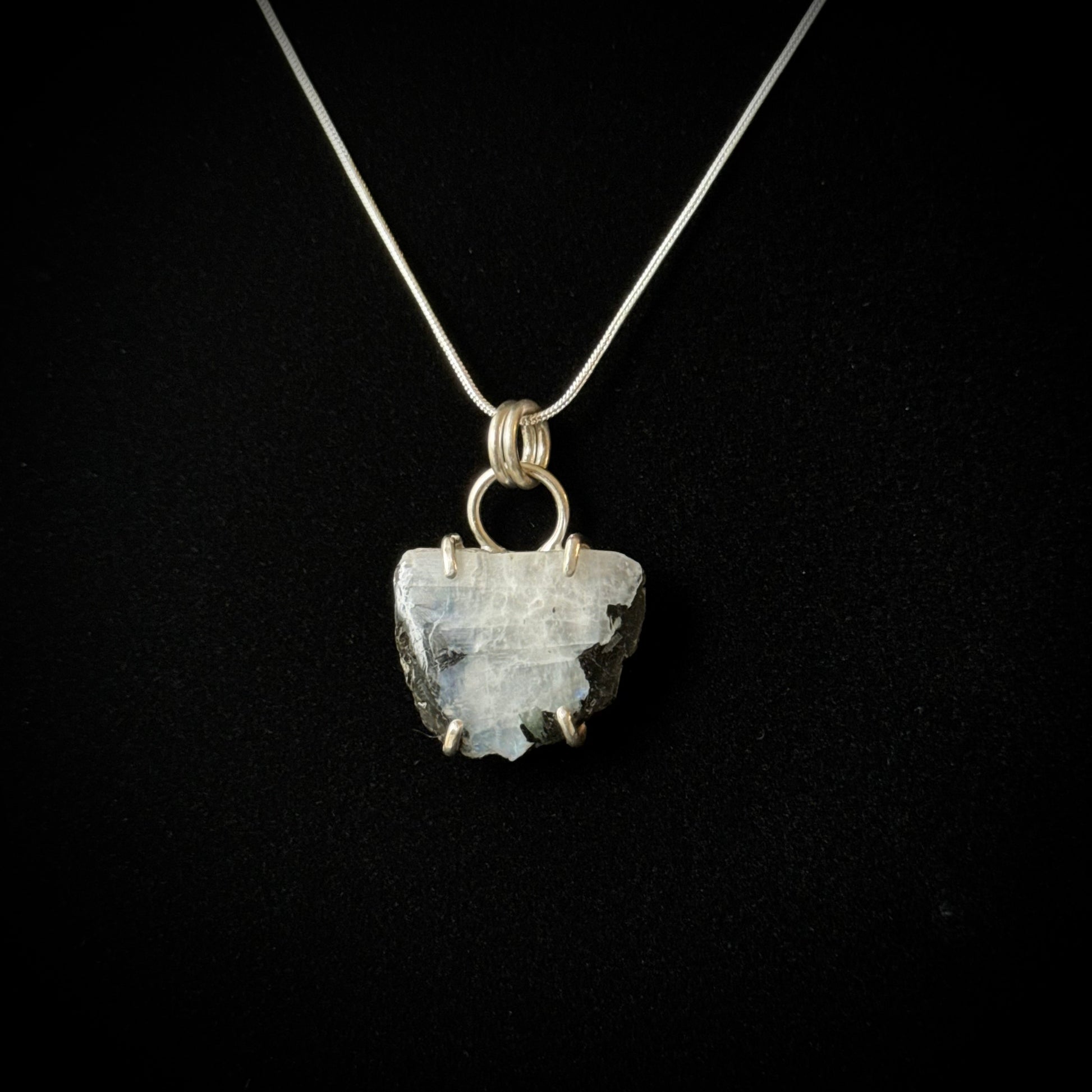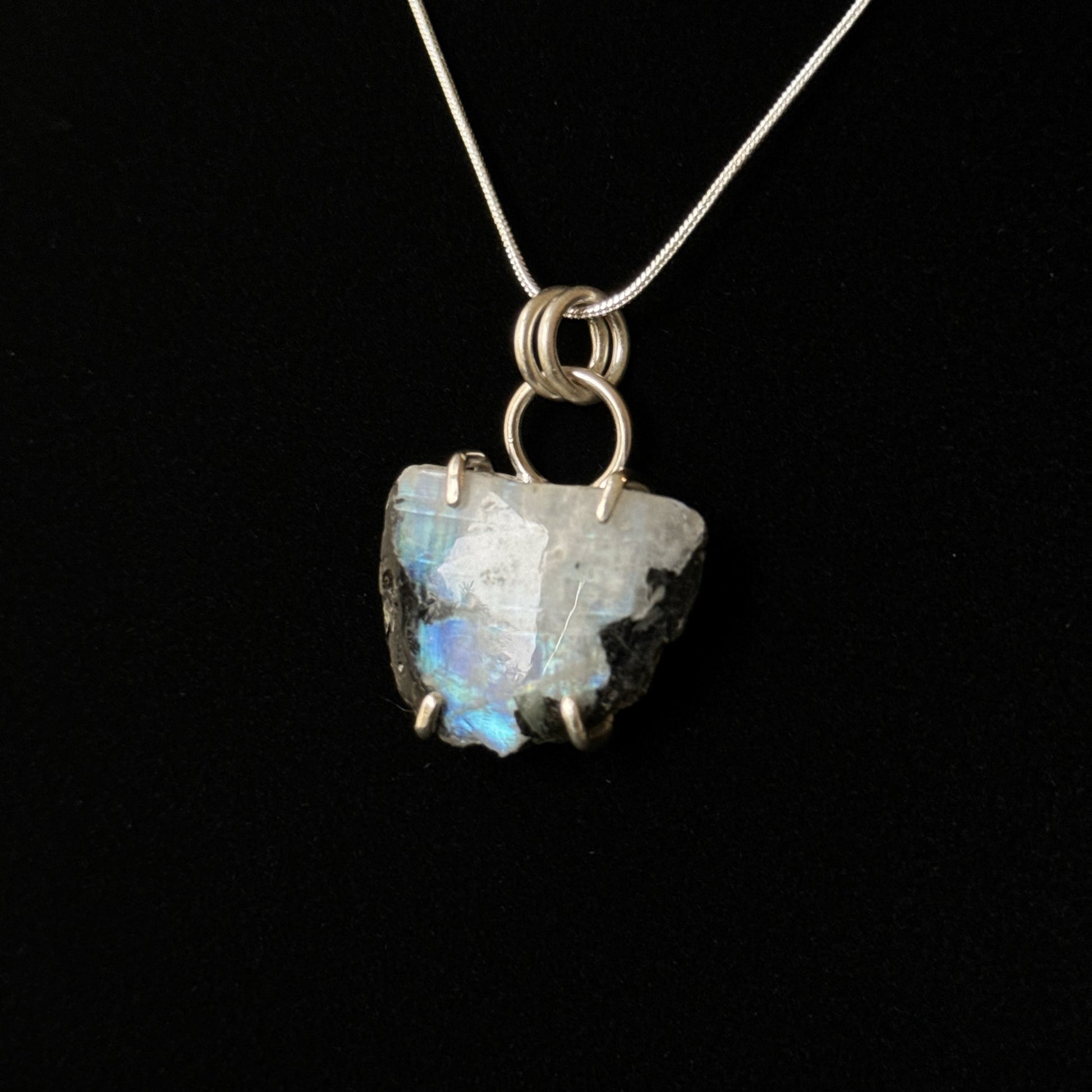 This handmade necklace has a beautiful raw slice of rainbow moonstone and tourmaline. Set in a sterling silver claw setting. It comes with a sterling silver 18" snake chain.