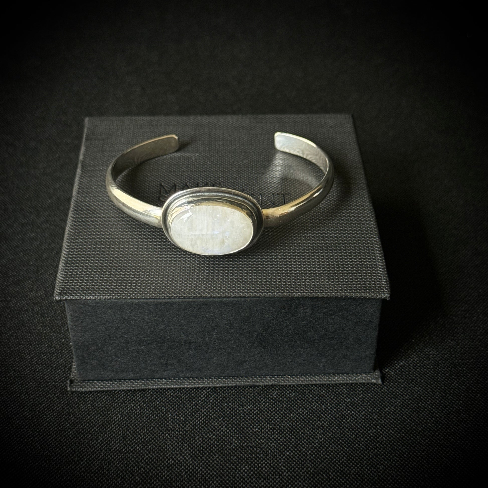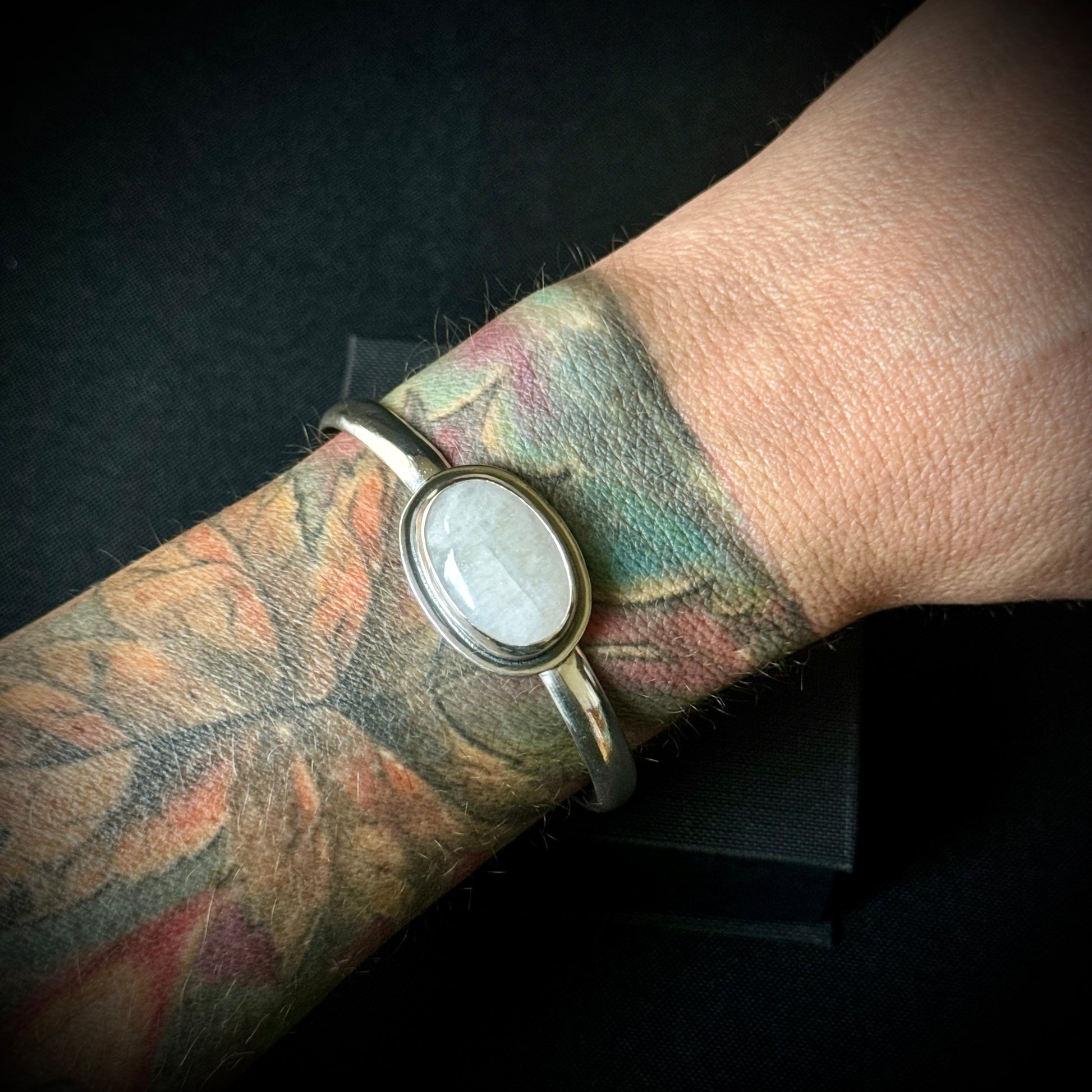 This sterling silver cuff has a beautiful rainbow moonstone stone set in sterling and fine silver.
