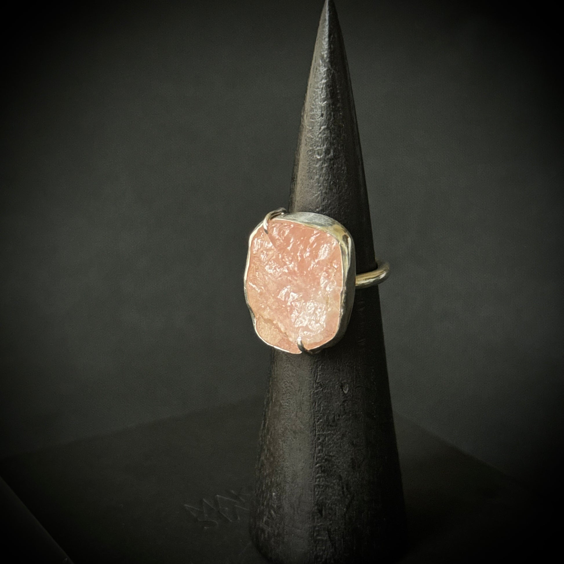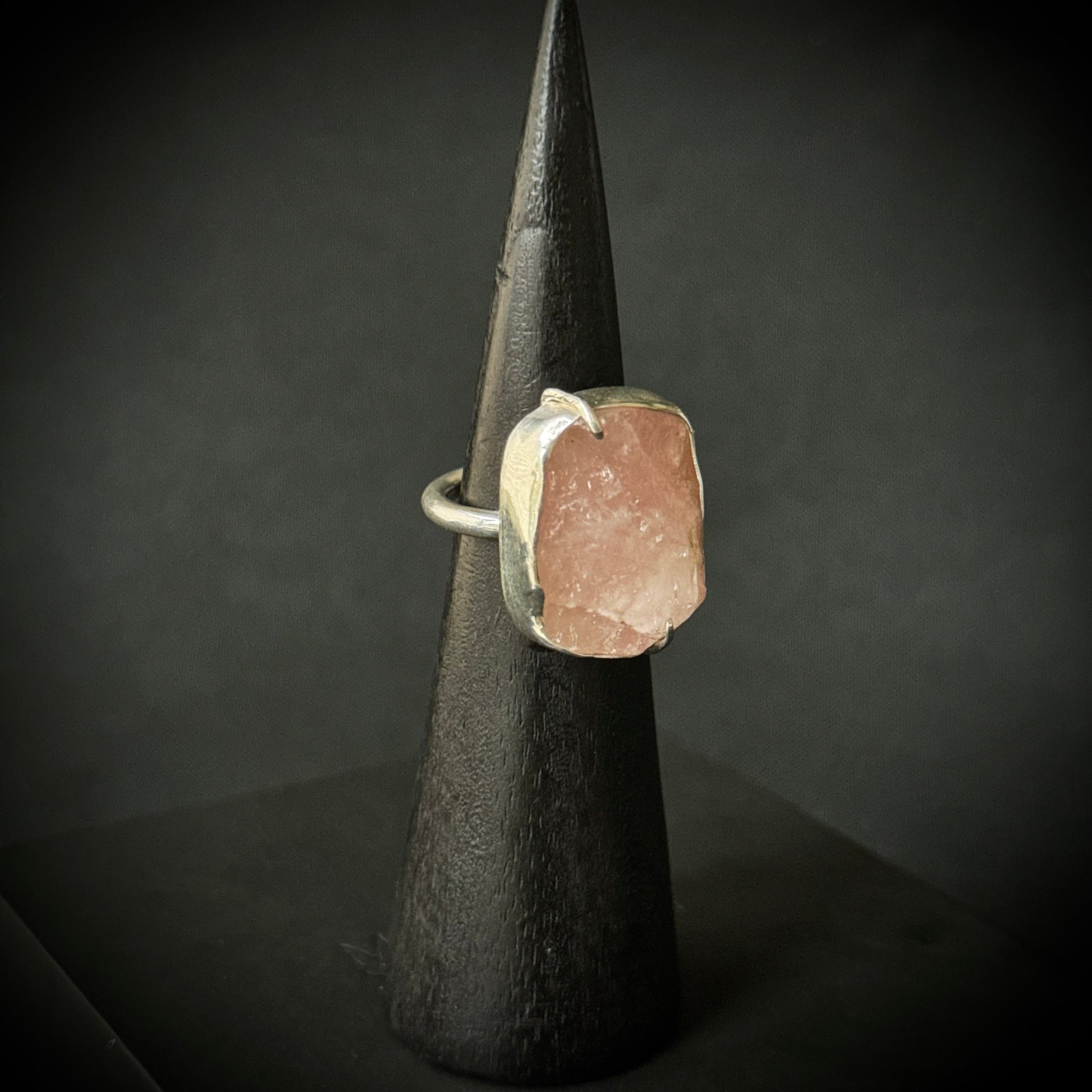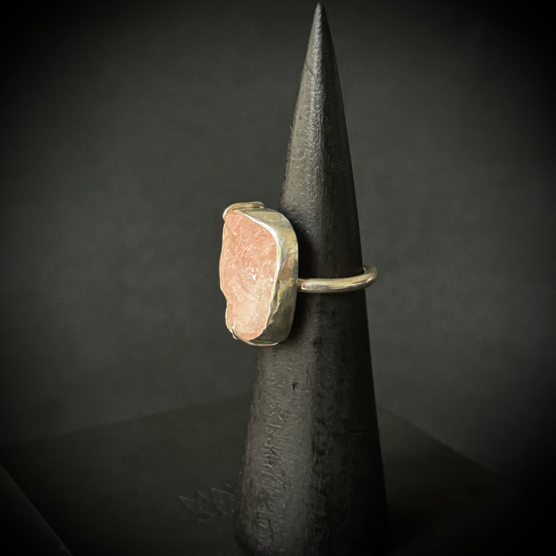 This unique statement ring has a rose quartz druzy gemstone set in sterling and fine silver.