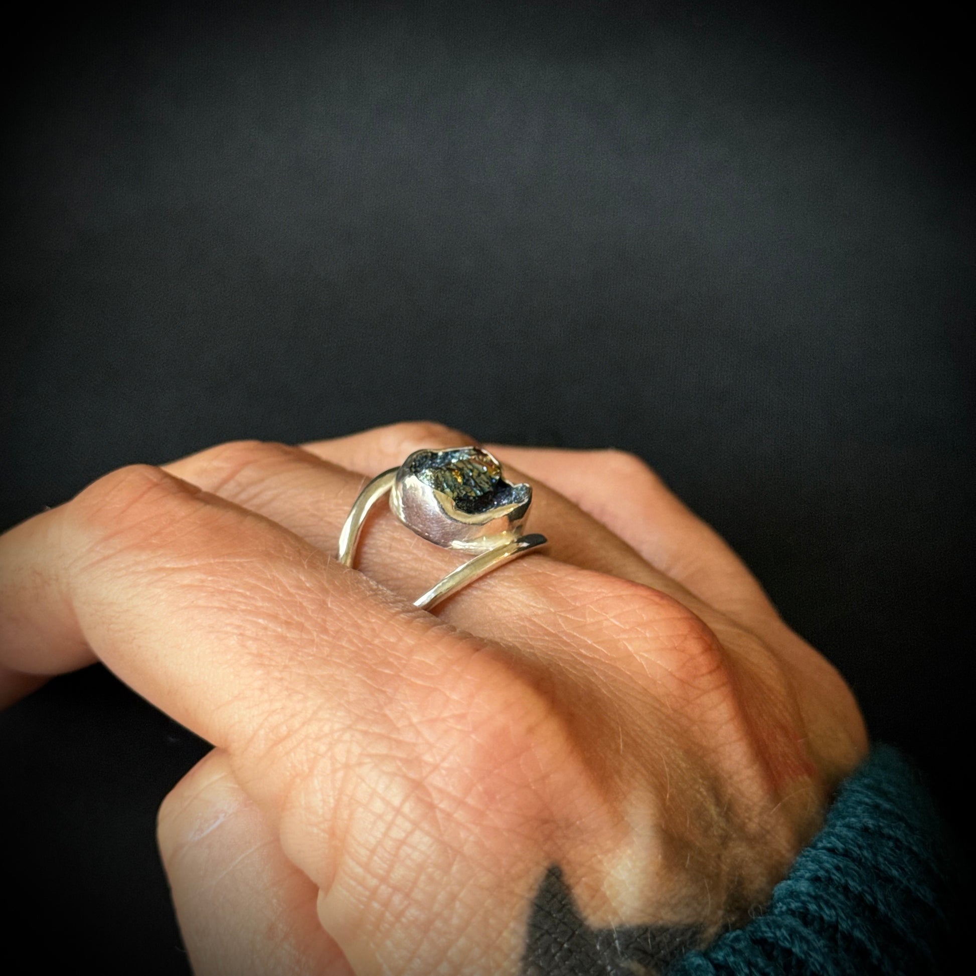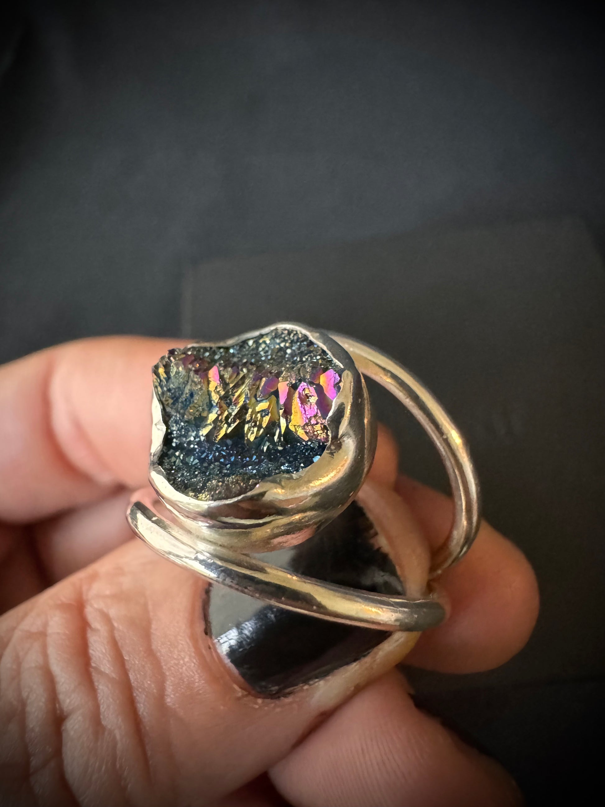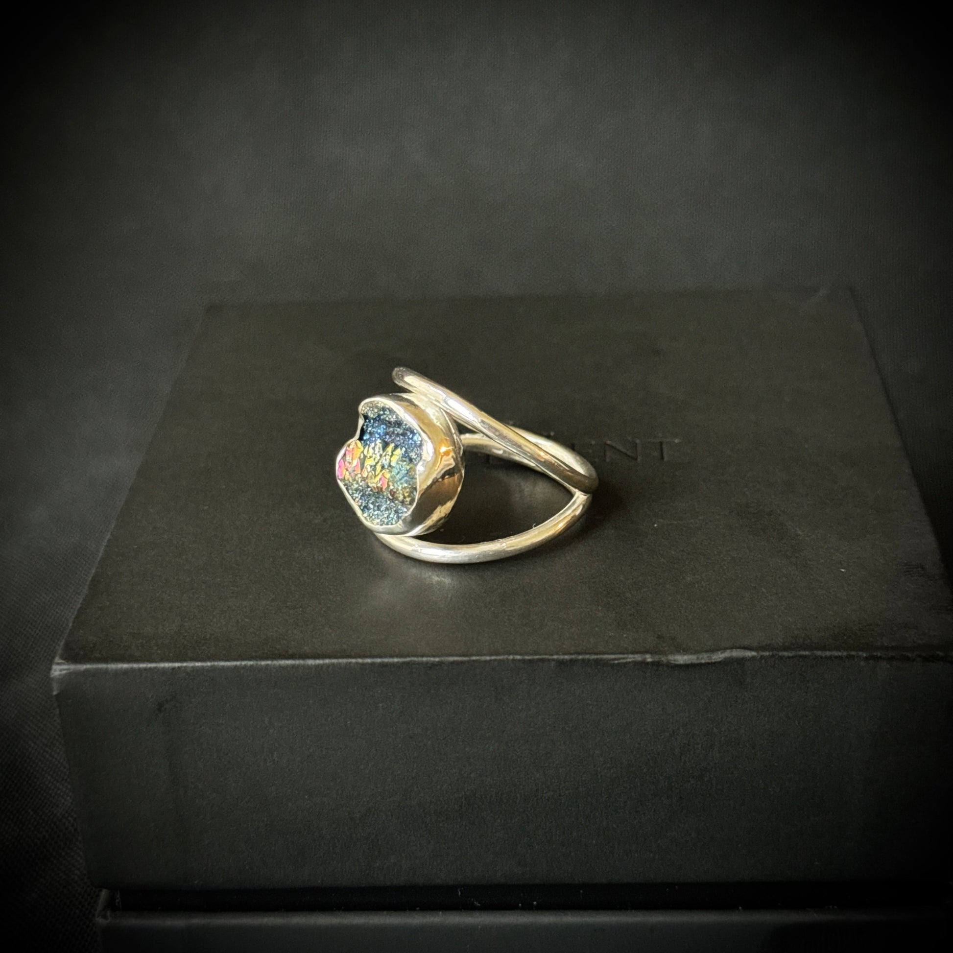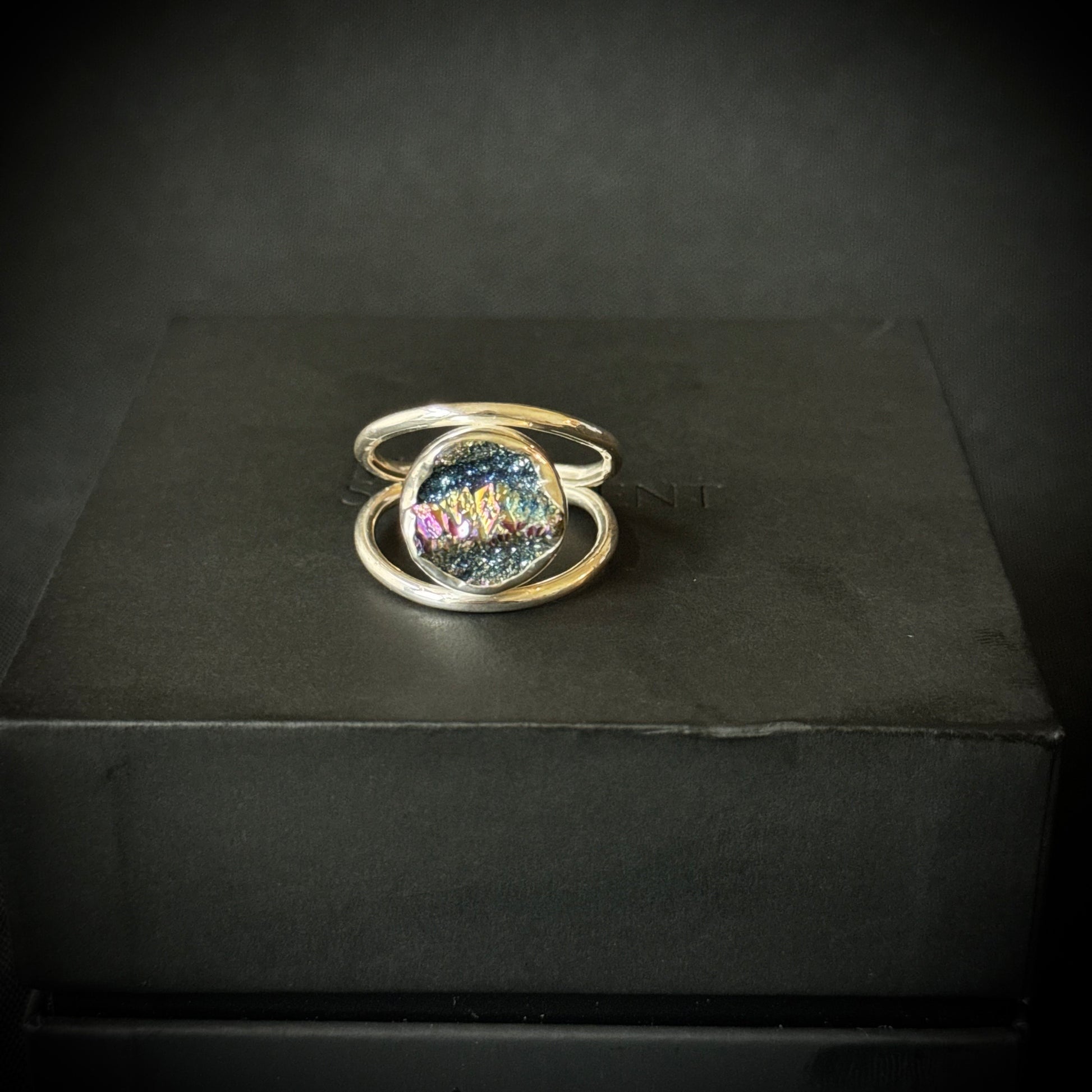 This super sparkly statement ring has a titanium druzy stone set in sterling and fine silver with a double ring band.