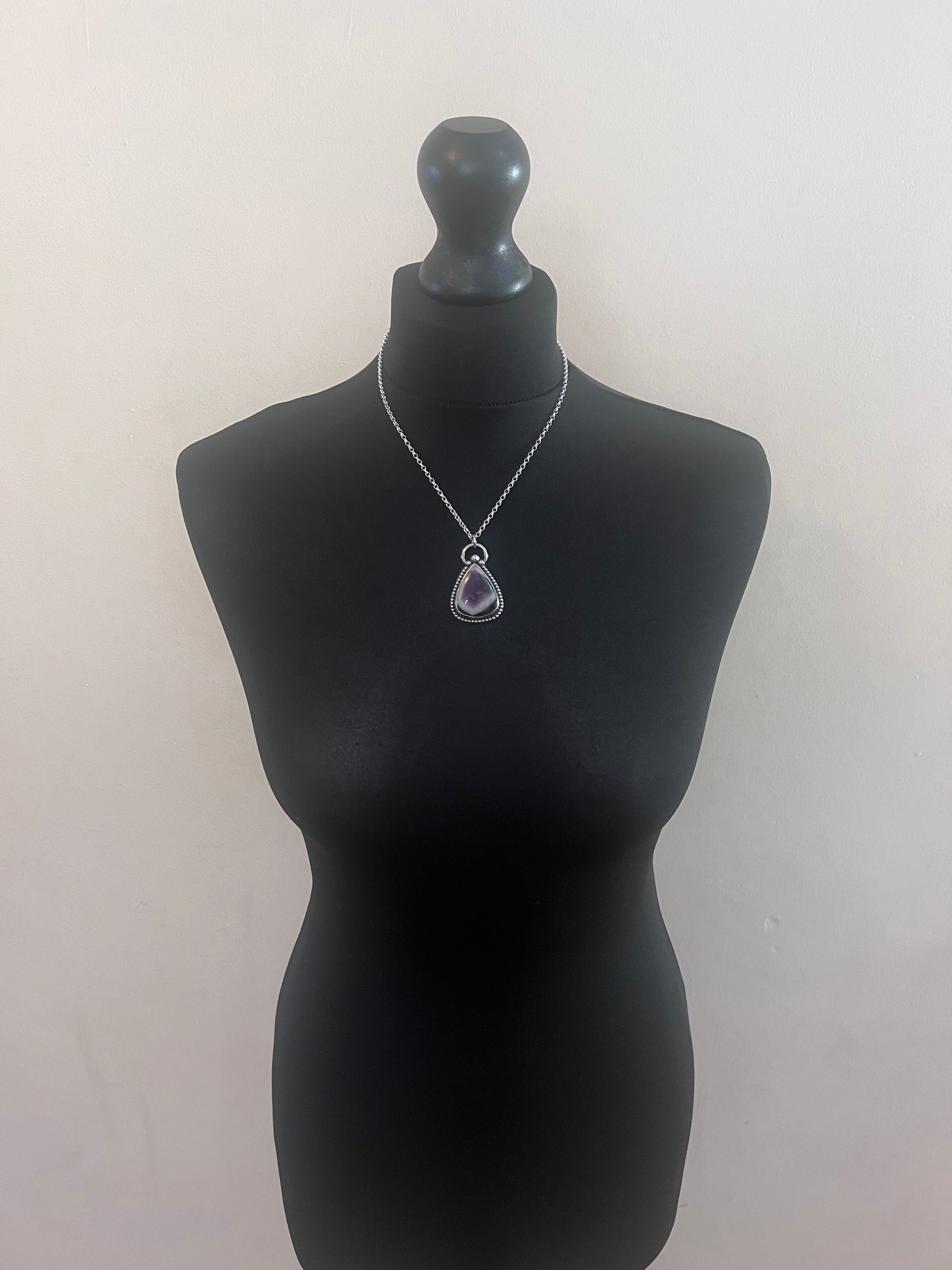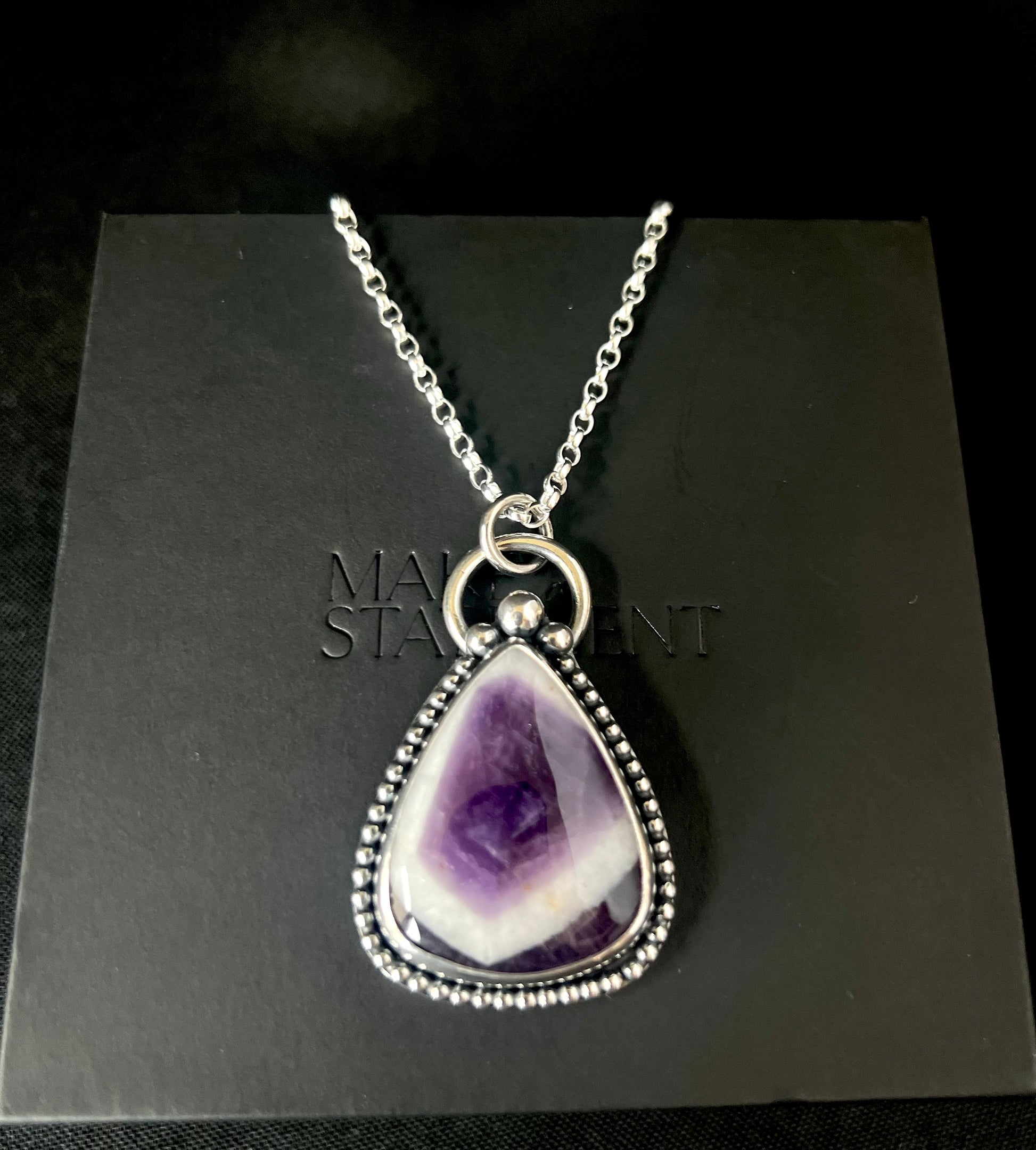 This handmade necklace has a unique trapiche amethyst set in sterling and fine silver surrounded by oxidised beading and silver ball embellishments. It comes with a sterling silver 18" belcher chain.