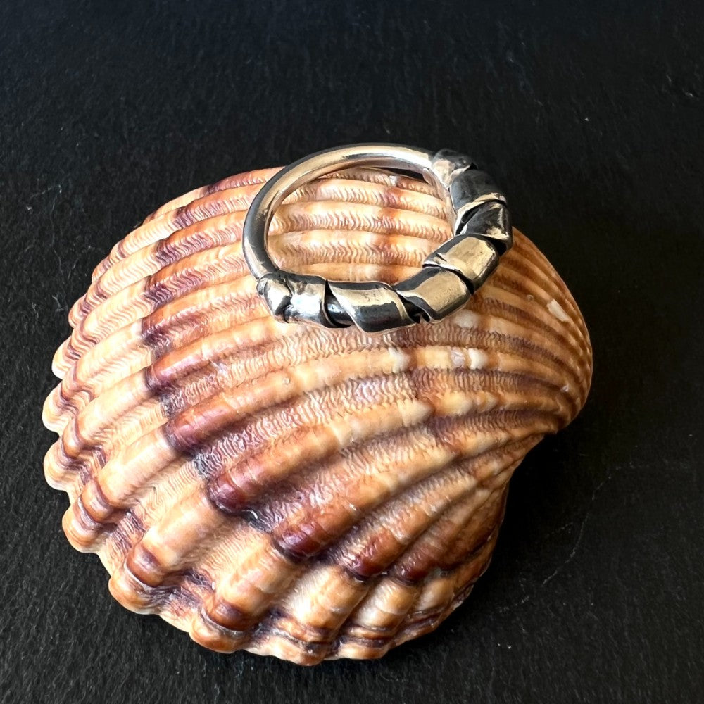 This usual ring was handmade using sterling silver and has an oxidised finish.